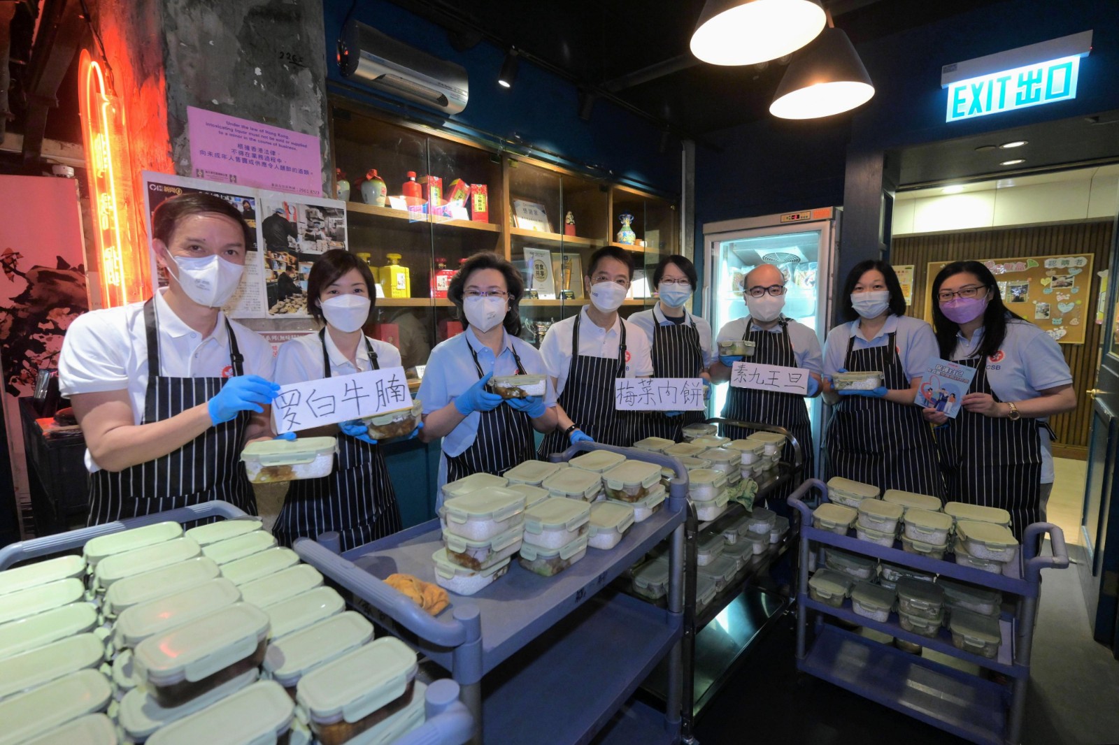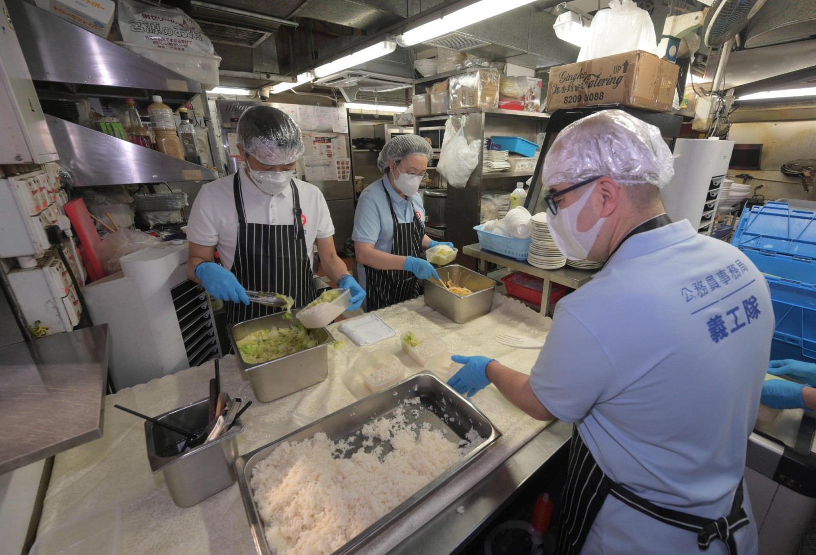 義工隊各人分工合作,在餐廳的廚房及不同崗位協助預備食物,分包飯盒、湯盒,然後安排向約150名長者和有需要人士派發「福飯」,送上關懷,亦同時為未接種新冠疫苗的人士提供接種疫苗的資料。