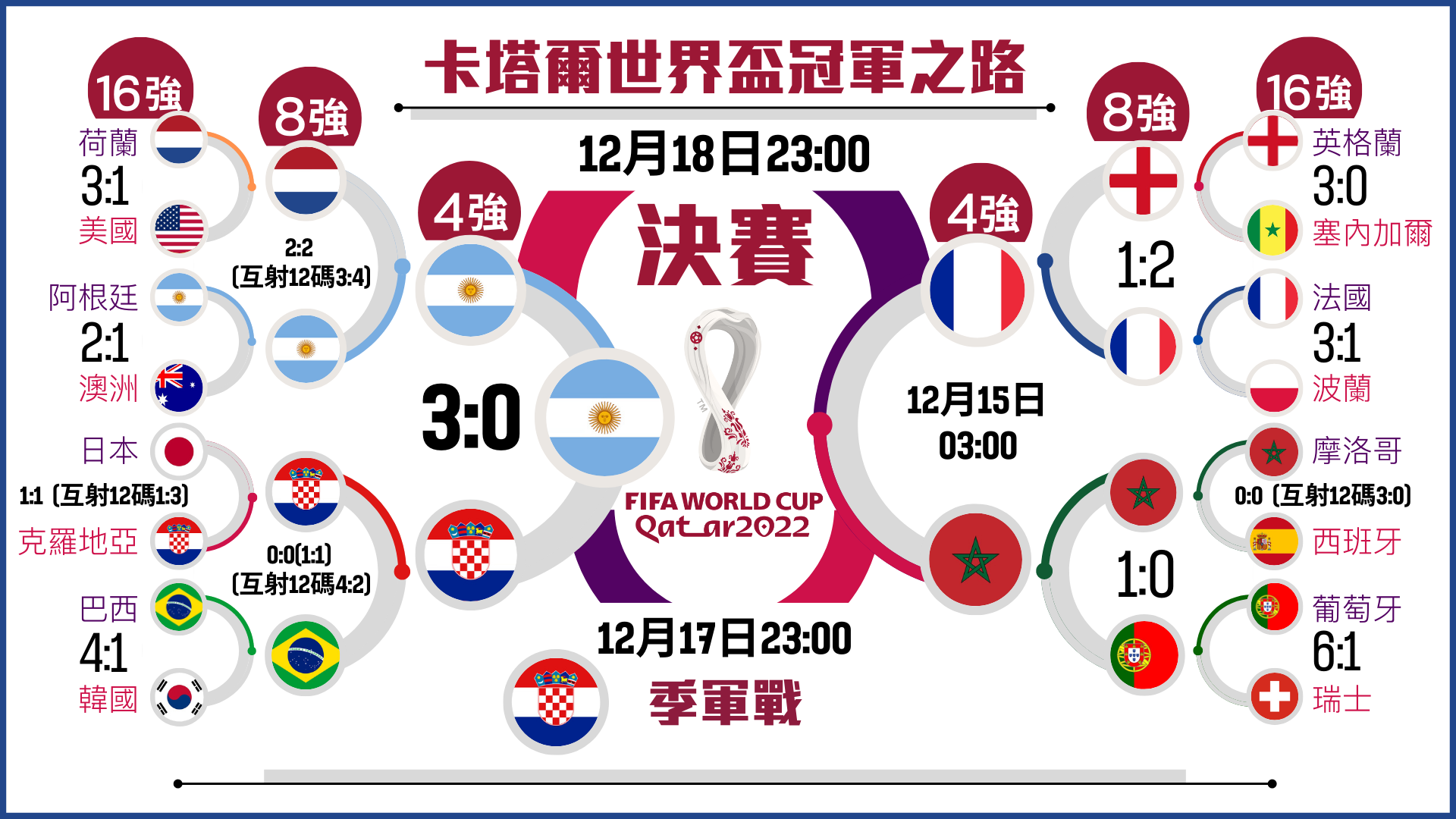 卡塔爾世盃首場4強決戰今日(14日)凌晨在魯賽爾球場上演,阿根廷(潘帕斯雄鷹)有美斯12碼先開紀錄,加上祖利安艾華利斯連中兩元,最終以3比0大勝上屆亞軍克羅地亞(格仔軍團),相隔8年之後,再次打入世盃決賽,美斯冠軍夢僅一步之遙。