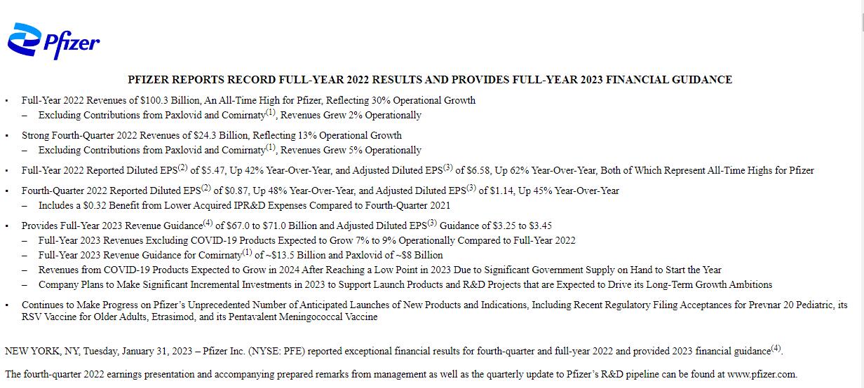 美國輝瑞公司1月31日披露的2022年財報顯示,2022年公司營收為1003億美元,同比增長23%,創歷史新高。如果剔除Paxlovid和Comirnaty的貢獻,2022年營收同比增長2%。2022年公司淨利潤為313.72億美元,同比增長43%。