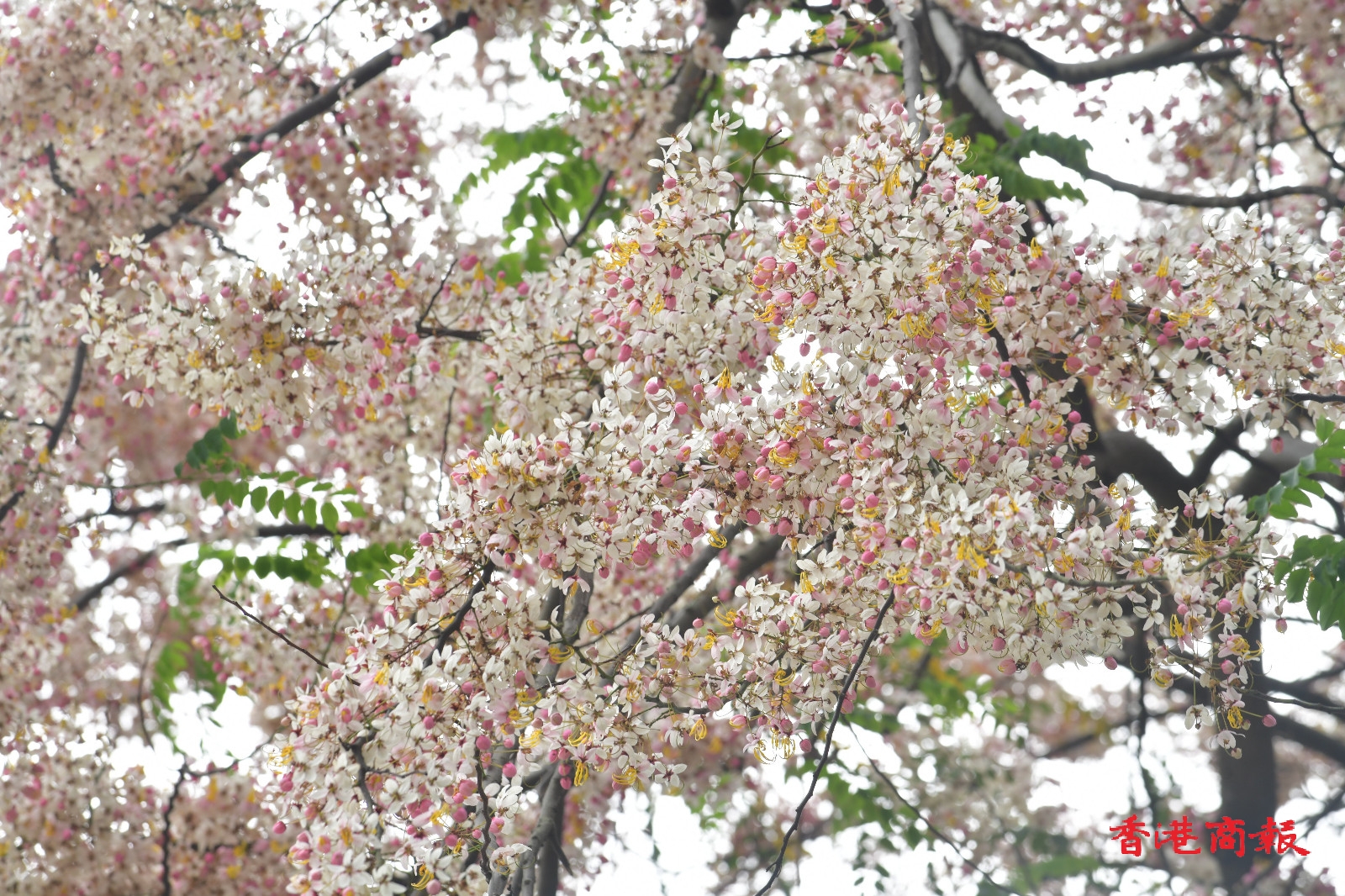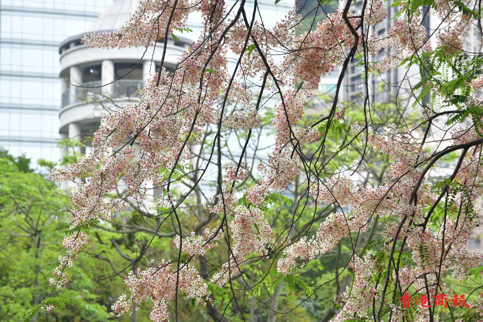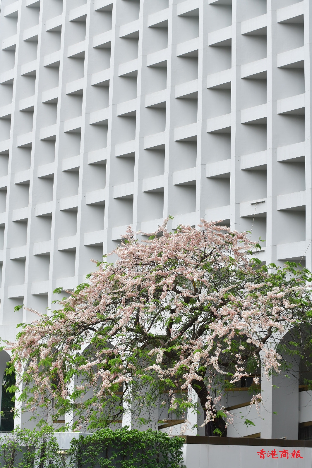 中環美利酒店停車場外,每年4、5月總會成為打卡好地方,一棵屹立百年的古樹節果決明樹總會靜悄悄在這春夏交替季節綻放特色花串,令人神往。近日這棵節果決明古樹已開花,樹身高約17米,但花束是一串串粉嫩嫣紅、白色小花交錯綻放,沿着連綿不絕的樹枝開花。驟眼看不算繁花茂密盛放,但淡白粉紅的小花顯得優雅高貴,在美利酒店襯托下,總予人一種古典美。不少市民趁五一假期前來探訪節果決明樹,打打卡、賞賞花,一起為今天喝采。(崔俊良攝)