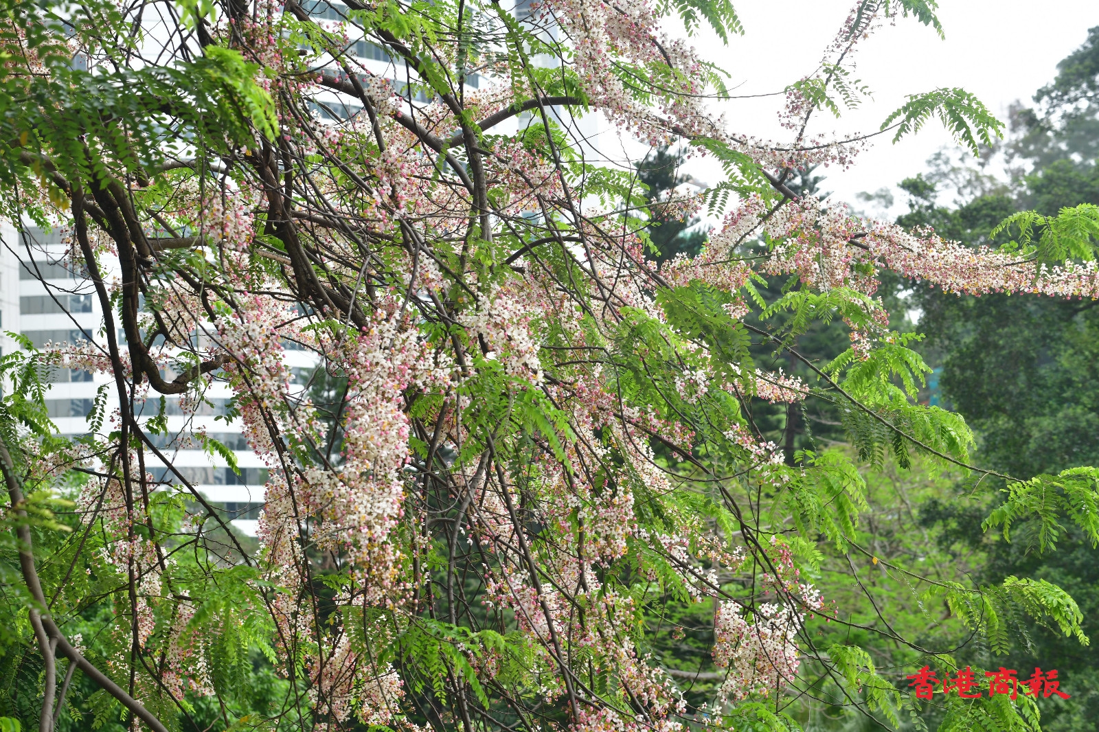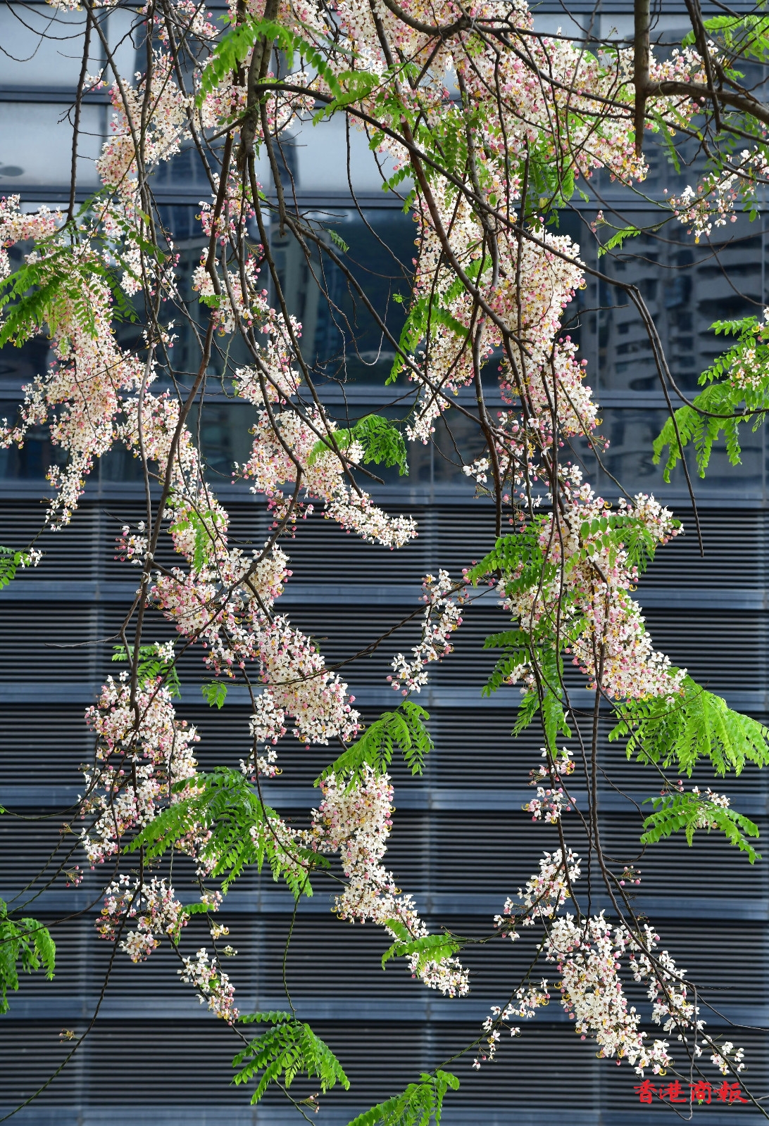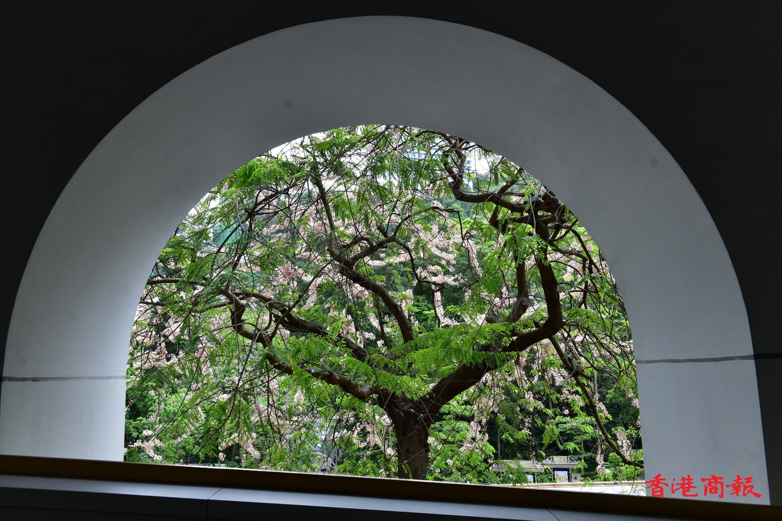 中環美利酒店停車場外,每年4、5月總會成為打卡好地方,一棵屹立百年的古樹節果決明樹總會靜悄悄在這春夏交替季節綻放特色花串,令人神往。近日這棵節果決明古樹已開花,樹身高約17米,但花束是一串串粉嫩嫣紅、白色小花交錯綻放,沿着連綿不絕的樹枝開花。驟眼看不算繁花茂密盛放,但淡白粉紅的小花顯得優雅高貴,在美利酒店襯托下,總予人一種古典美。不少市民趁五一假期前來探訪節果決明樹,打打卡、賞賞花,一起為今天喝采。(崔俊良攝)