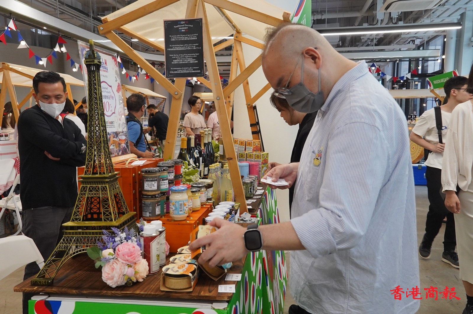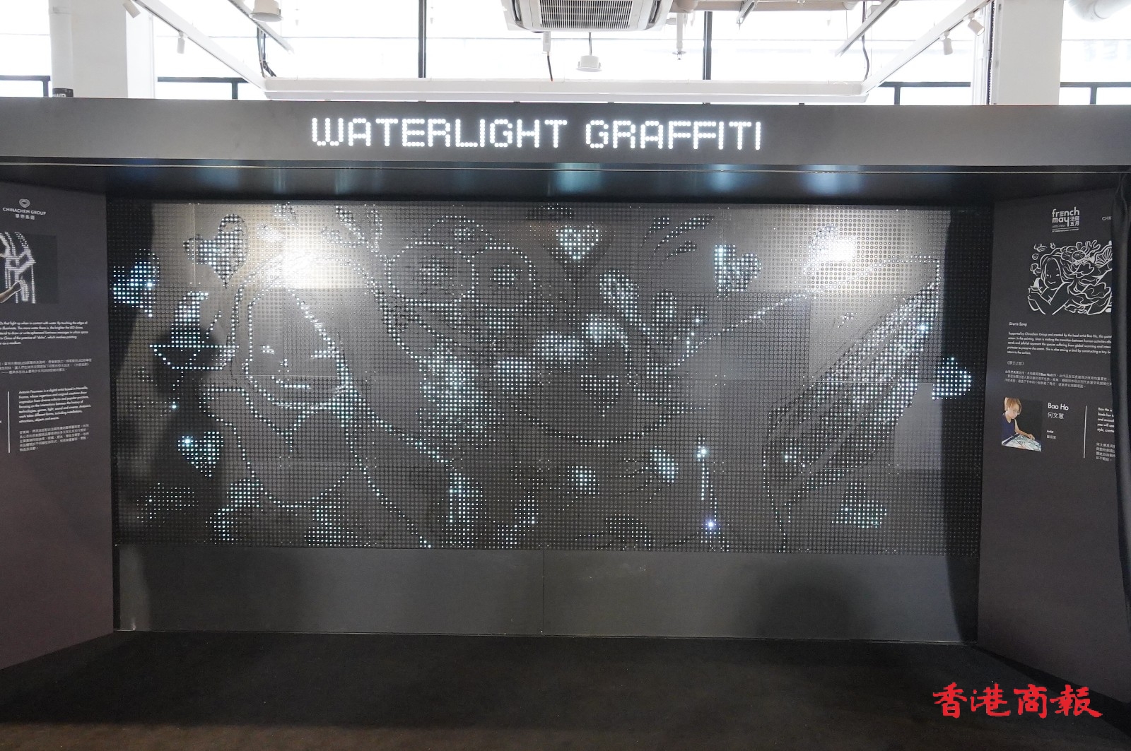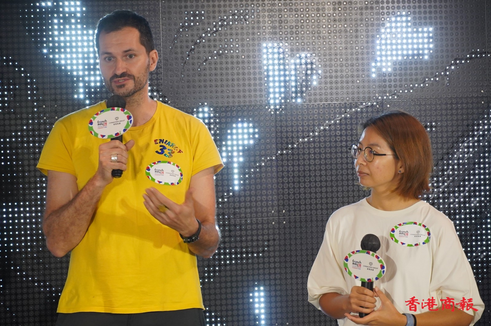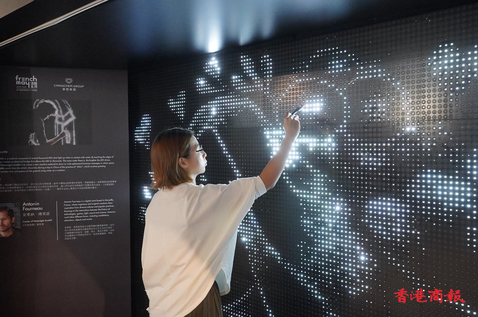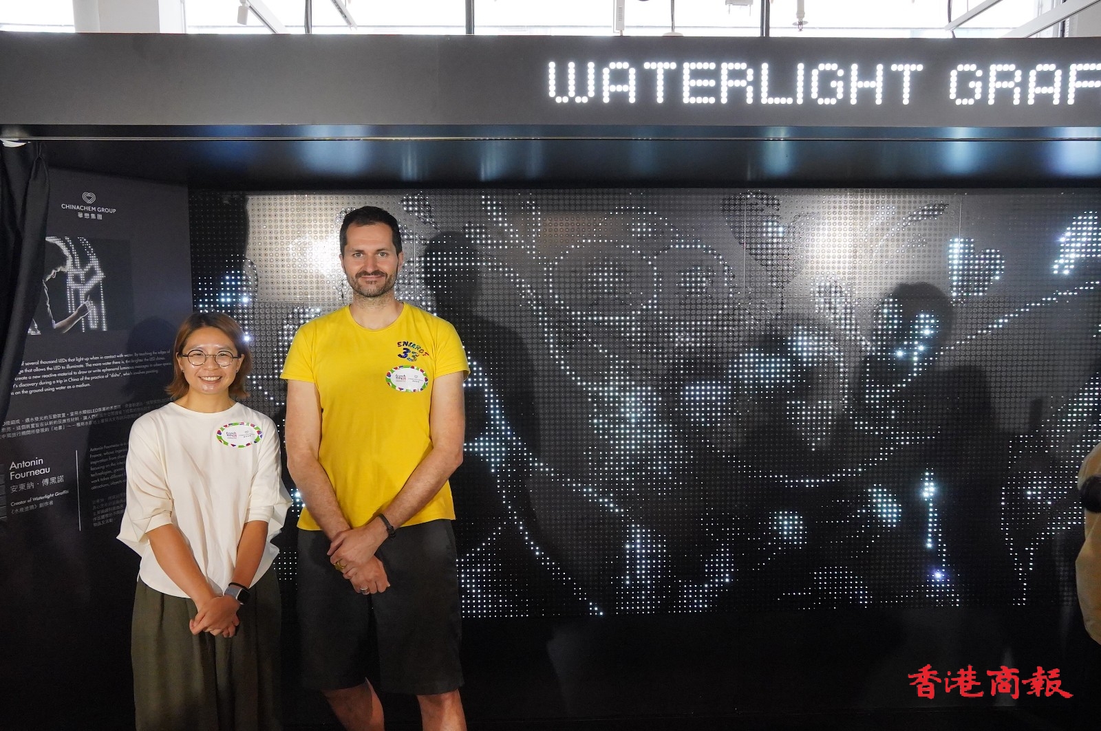 除了深受歡迎的法國傳統市集外,今年還與華懋集團共同呈獻中西方的藝術交流——在法國藝術家安東納‧傅黑諾帶來互動藝術裝置《水燈塗鴉》的同時,香港藝術家何文蕙亦為大家獻上別具意義的藝術創作。《水燈塗鴉》旨在以新穎及獨特的方式創造環保藝術,並由何文蕙在此裝置上創作兩幅以自然為靈感的畫作,體現跨港法文化的交流。兩位藝術家今日亦在中環街市親身見證《水燈塗鴉》揭幕,何文蕙即席完成畫作《塞壬之歌》,令開幕儀式生色不少。作品描繪一位海洋守護者在全球暖化和密集的人類活動的雙重影響下,仍努力保護海洋及海洋生物,呼籲人類保護海洋和自然環境。(記者 俊文攝)