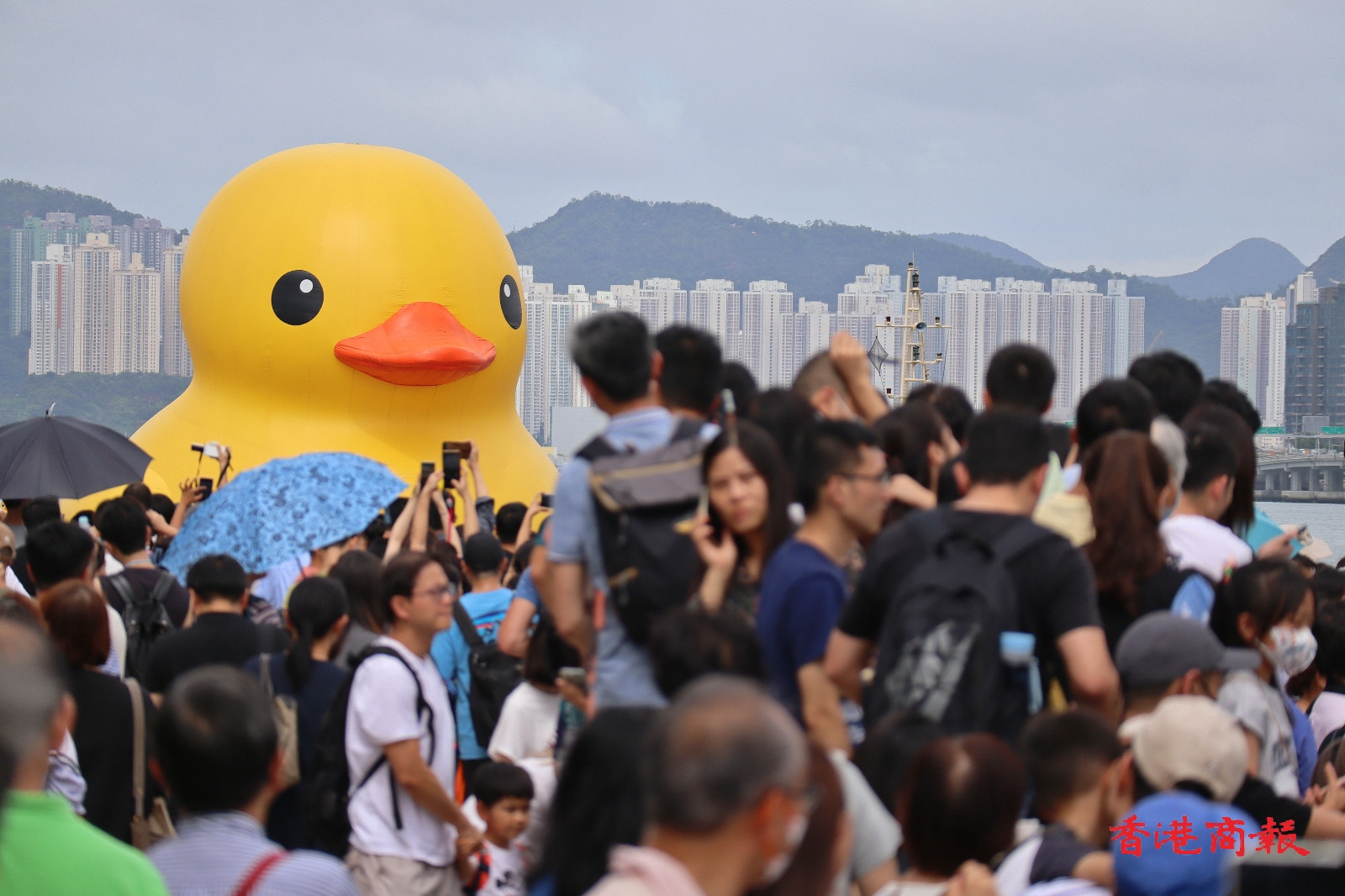 兩隻巨型黃色橡皮鴨最後一日在維港展出,其中一隻大黃鴨約下午1時半左右起沿維港兩岸巡遊,吸引不少市民在維港兩岸觀賞,尖沙咀海傍更是萬人空巷,人潮如湧。早上天氣雖然不穩,但仍有不少市民冒雨前來,一早佔據有利位置,希望近距離一睹大黃鴨的風采。除了香港市民,也有不少路經的旅行團駐足觀看,更有些內地遊客早上乘高鐵抵港,趕在展覽完結前與橡皮鴨合照。亦有市民對展覽結束感到失望和可惜,希望可以延長展期。