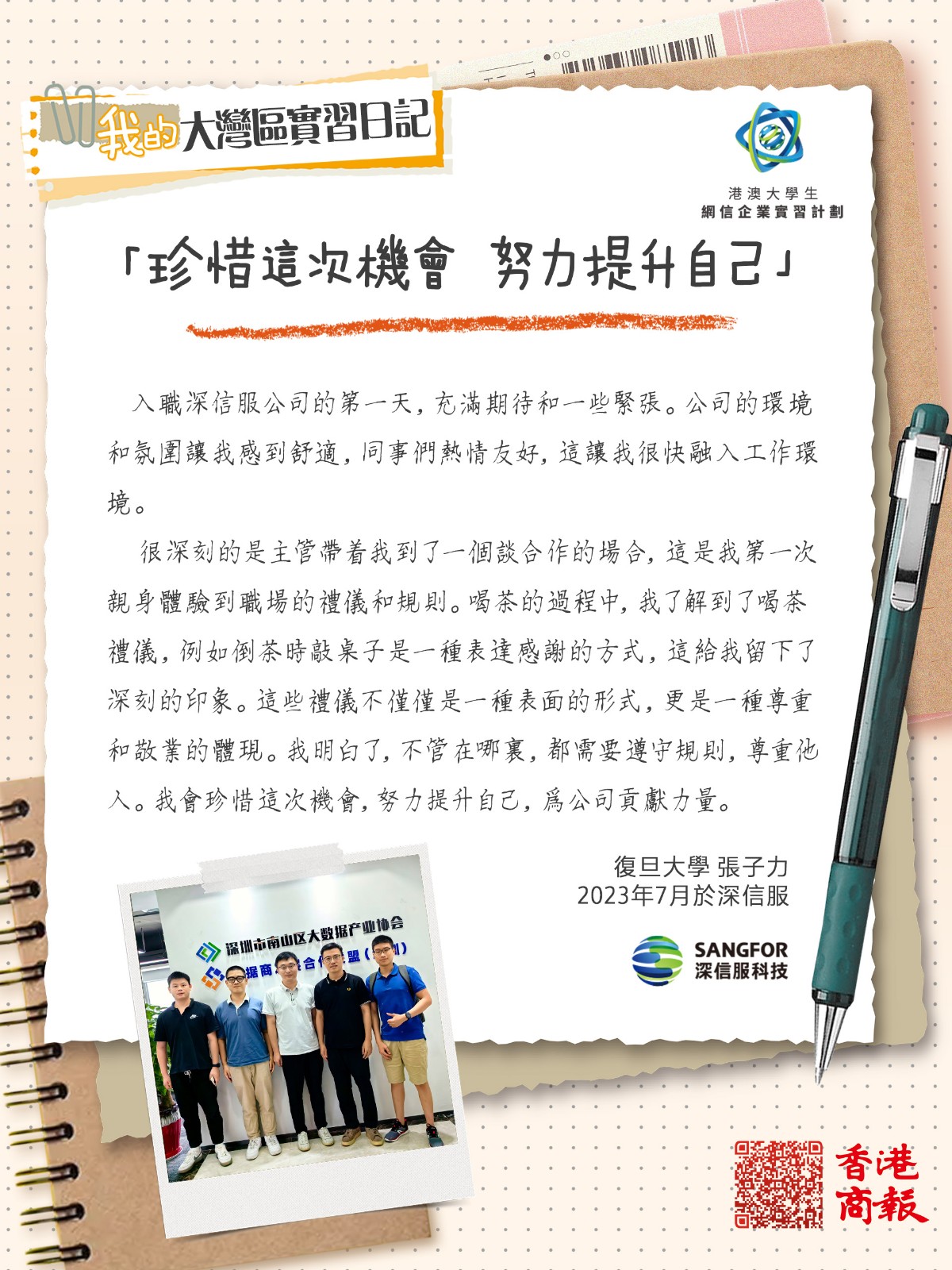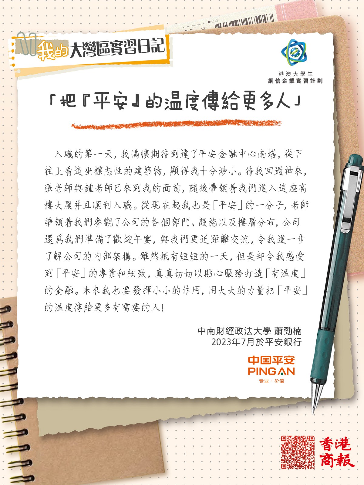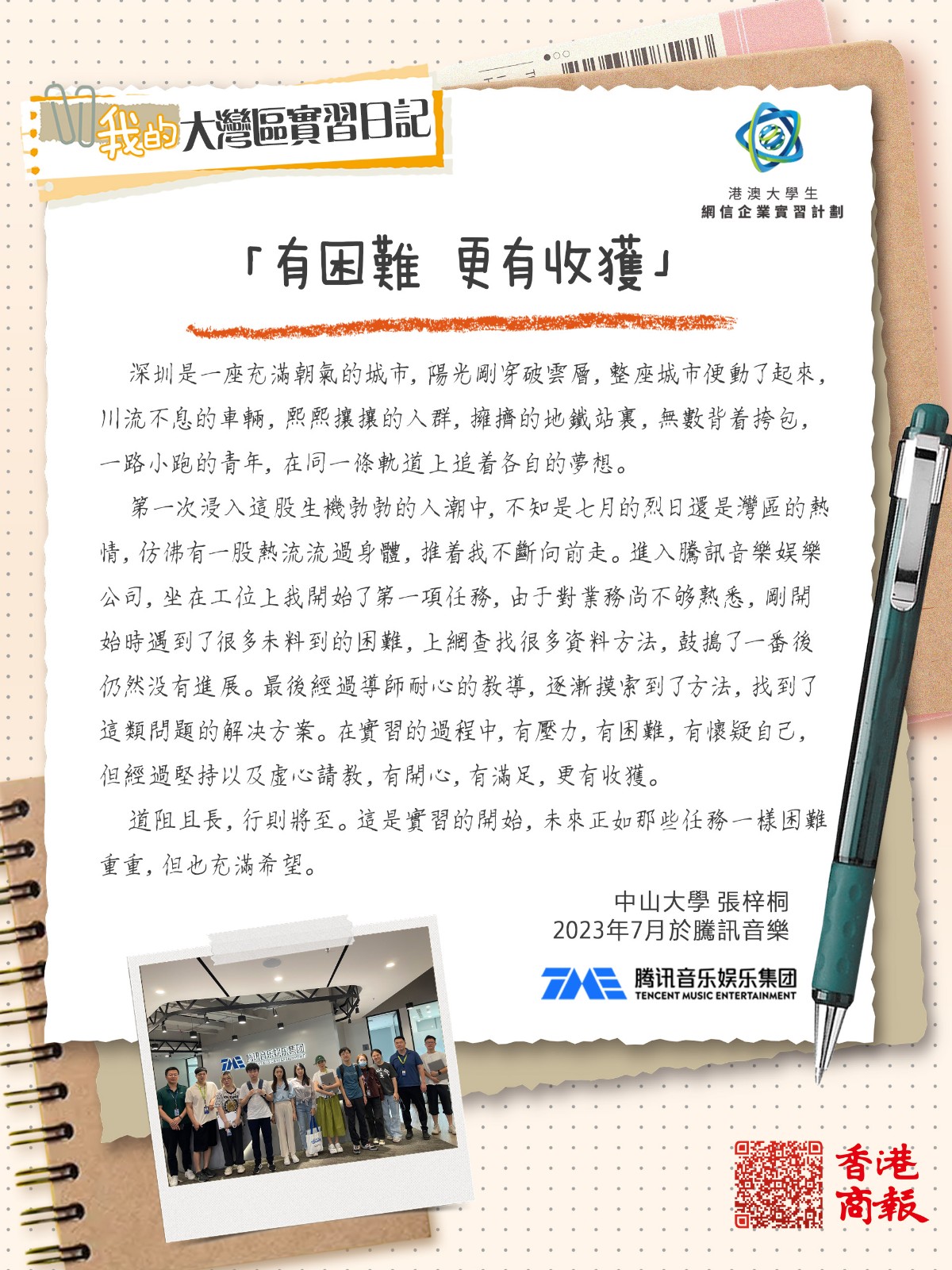 「2023港澳大學生粵港澳大灣區網信企業實習計劃」已於6月30日啟動,逾30名來自港澳的大學生正在9家深圳龍頭互聯網、高科技企業進行為期一個月的實習。實習初期大家感受如何?來看看大家的實習日記吧!