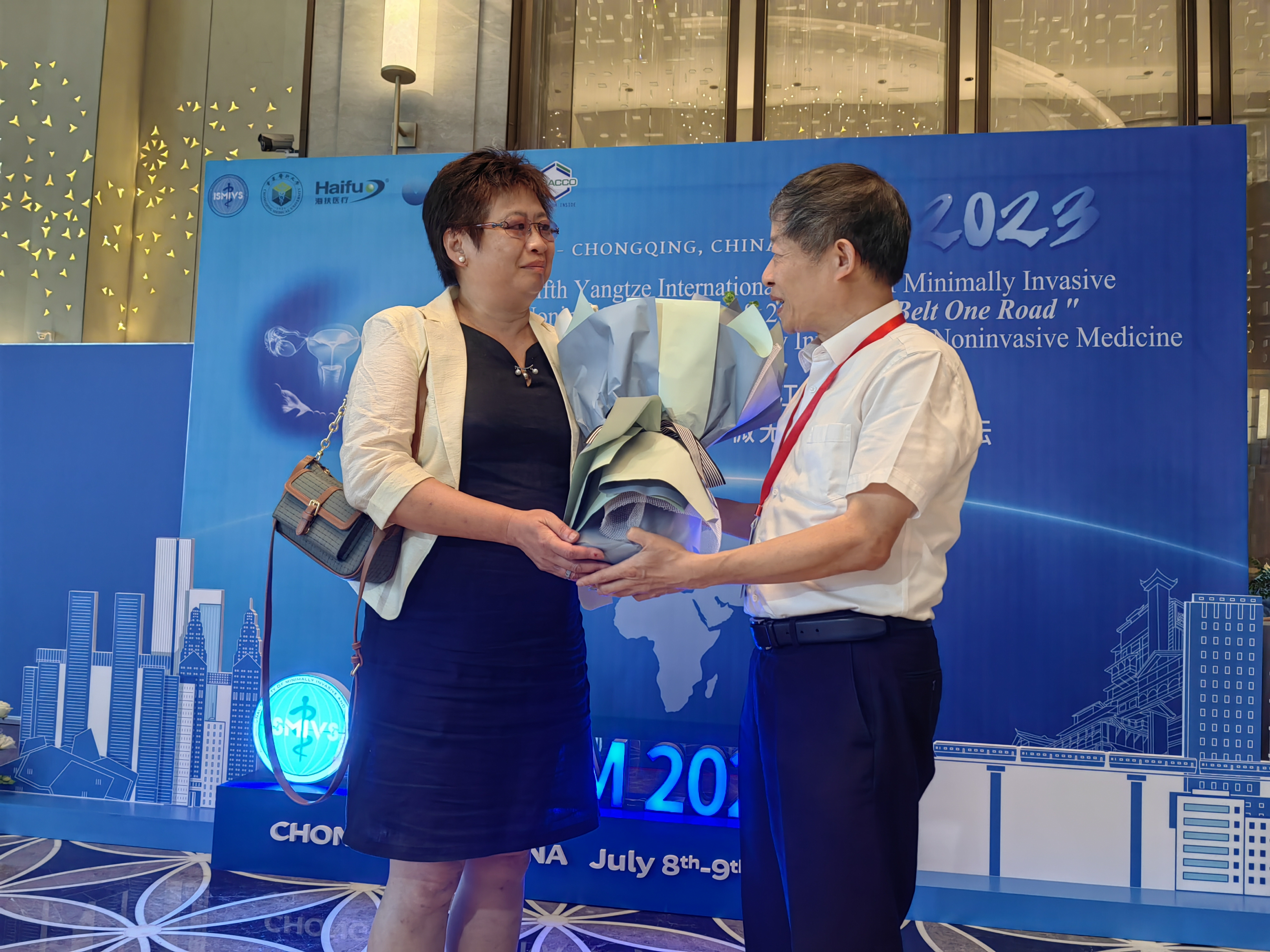 中国台湾病患(左一)专程赴会向重慶海扶醫療科技股份公司董事長王智彪教授(右一)致謝海扶刀®妙手回春