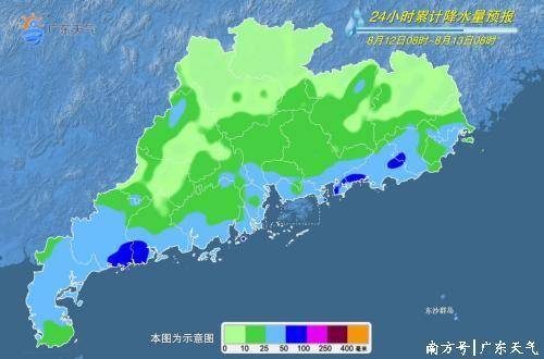 未來幾天具體預報:12日,粵西、珠江三角洲南部市縣和粵東市縣有暴雨,部分市縣大暴雨,其餘市縣多雲,有中(雷)雨,局部暴雨。最高氣溫:粵北市縣33℃~34℃,其餘市縣31℃~33℃。、