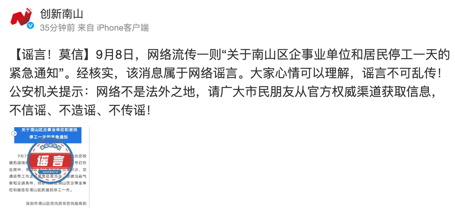 9月8日上午,「創新南山」官方微博發布一則闢謠稱:9月8日,網絡流傳一則「關於深圳南山區企事業單位和居民停工一天的緊急通知」。經核實,該消息屬於網絡謠言。大家心情可以理解,謠言不可亂傳!