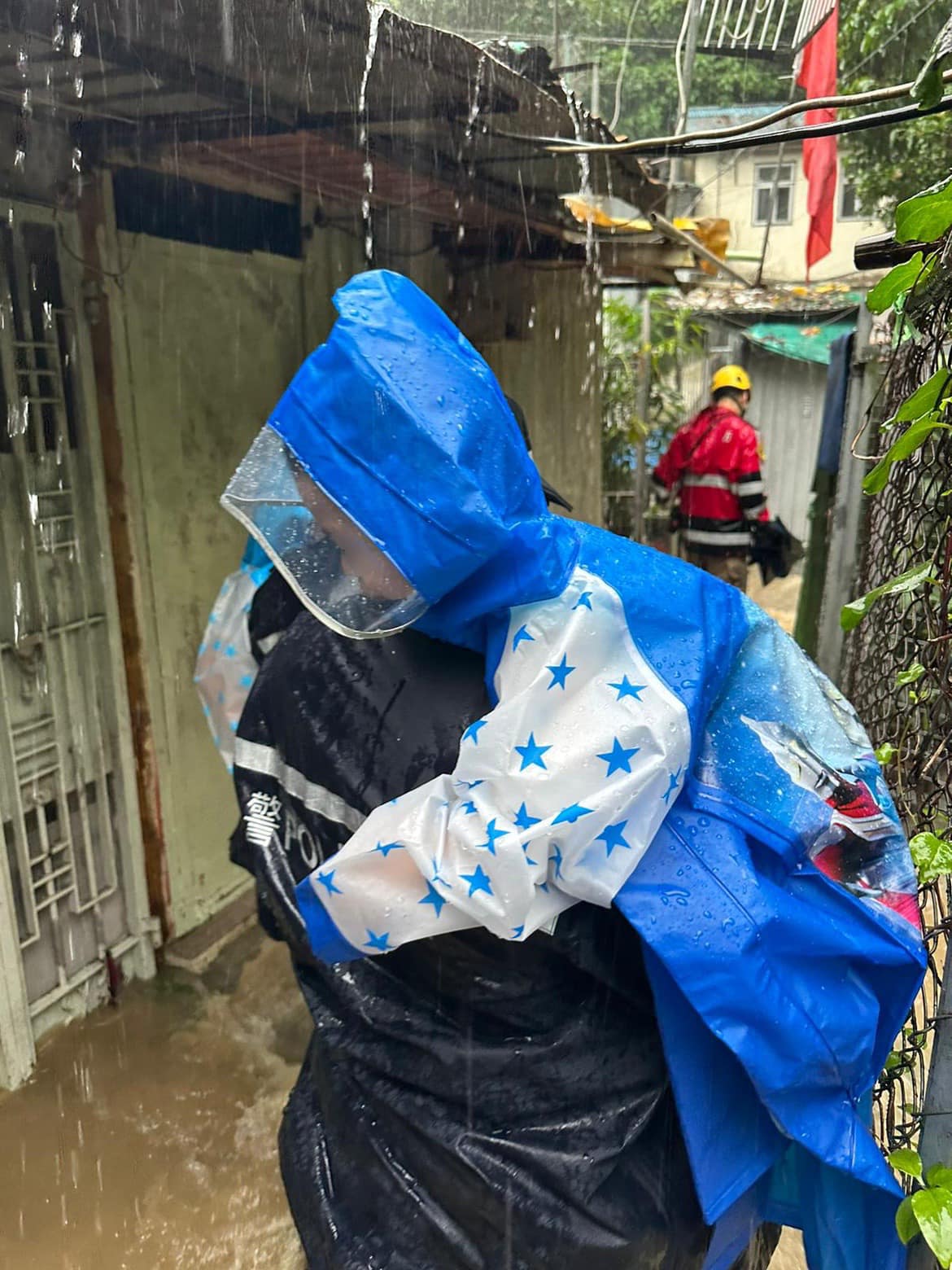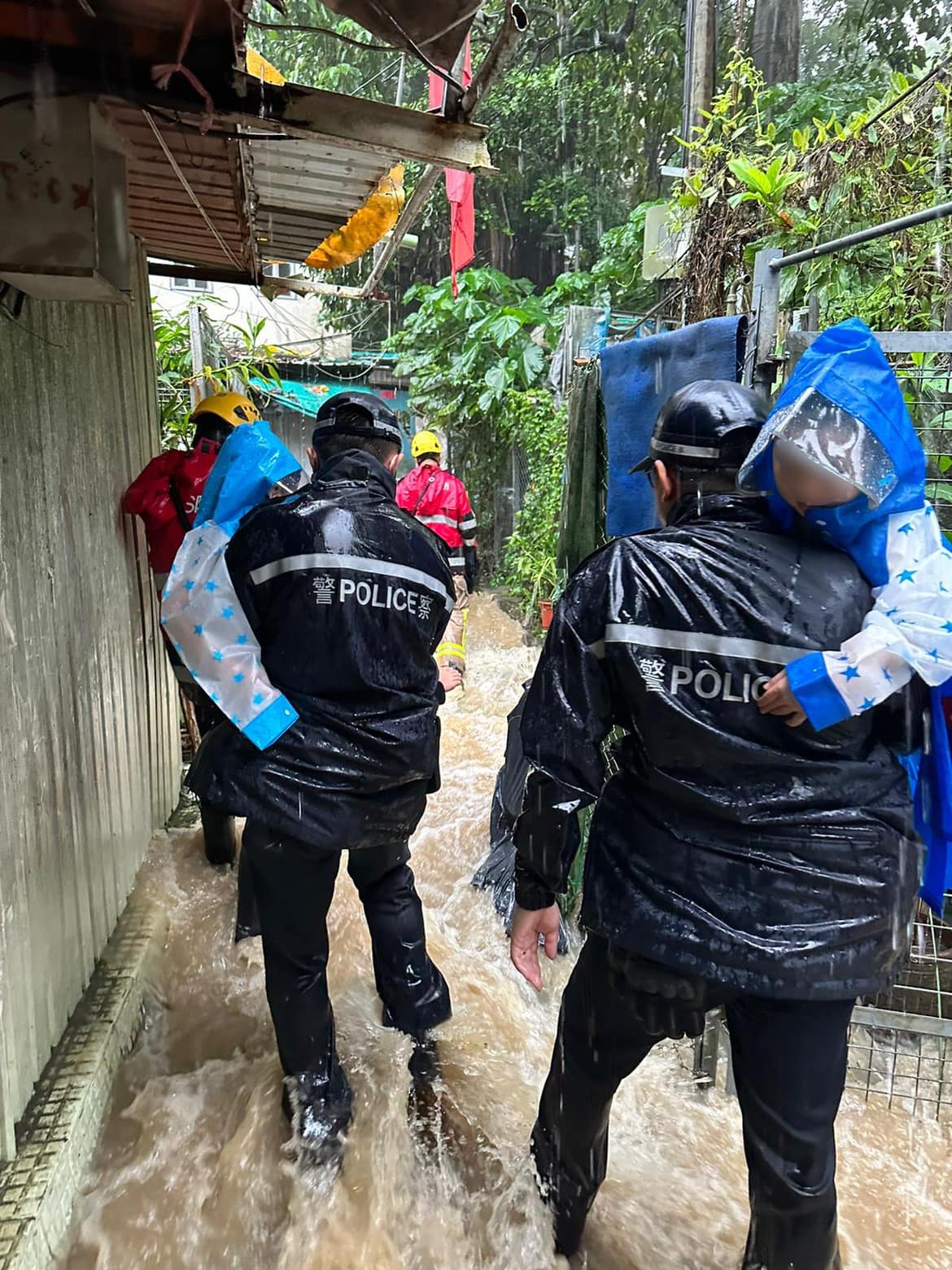 8日早上,警方人員接獲求助報告後趕至九華徑村將被困市民救到安全地點。(香港警隊社交媒體圖片)