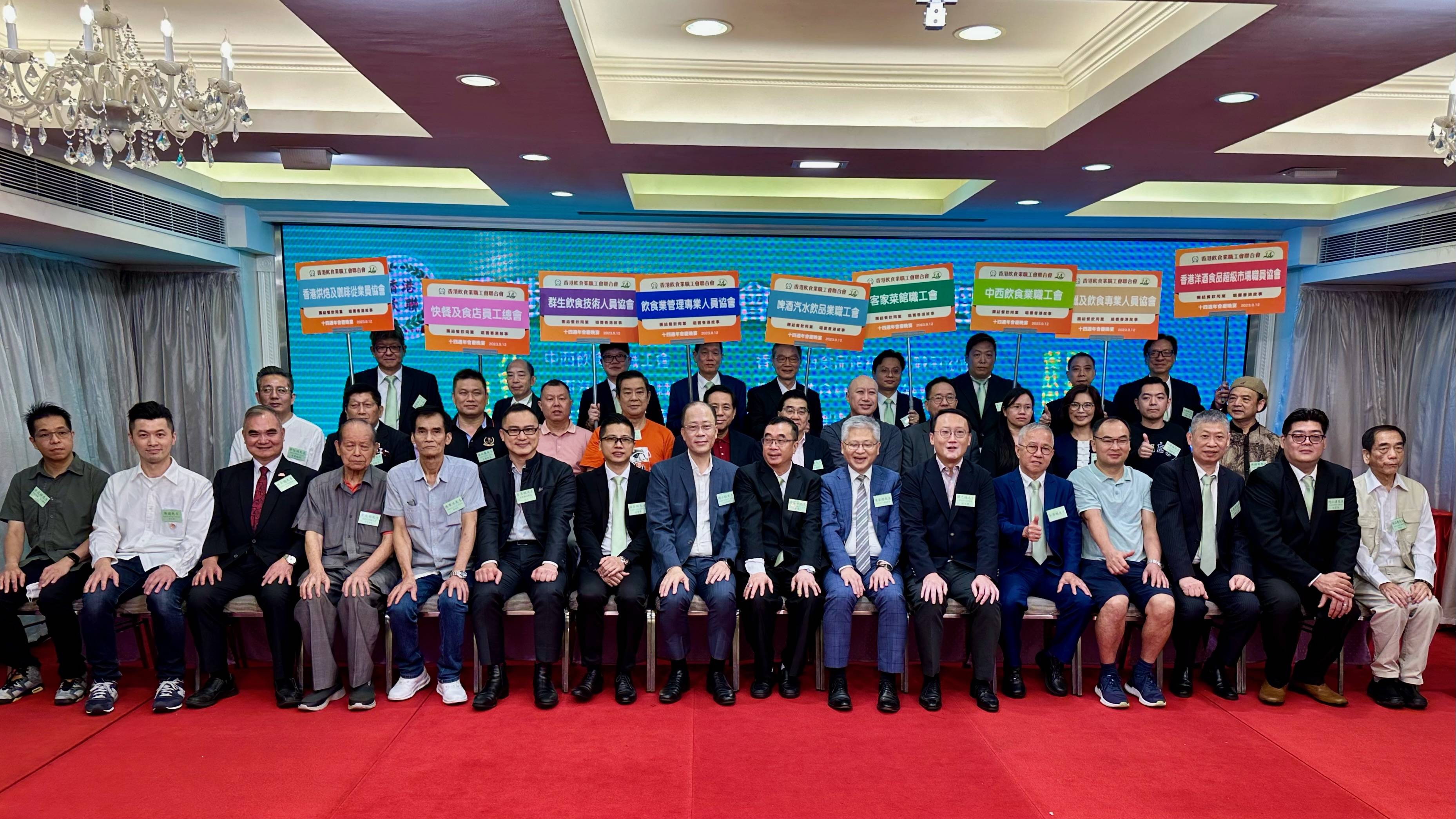 香港飲食業職工會聯合會15周年會慶晚宴日前假旺角倫敦大酒樓舉行,港九勞工社團聯會秘書長、立法會議員周小松 及勞聯副主席譚志聰,署理勞工處副處長陳家禮,中華廚藝學院院長葉漢鵬等主禮。