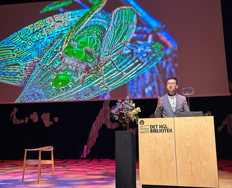 陳世英是世界著名的珠寶及雕塑藝術家,他以運用鈦金屬創作珠寶和大型雕塑而聞名。他亦是多項工藝技術的原創者,包括創於1987年的「世英切割」,以及比鋼堅硬五倍的「世英陶瓷」。在哥本哈根講座前,陳世英於9月在倫敦佳士得總部舉行「陳世英:時間輪盤」展覽,展出150件珠寶及6件鈦金屬雕塑,當中還包括世界上其中一顆最大的切割黑鑽石。他亦於9月在倫敦維多利亞與艾伯特博物館舉行客席講座。(圖源:政府新聞處)