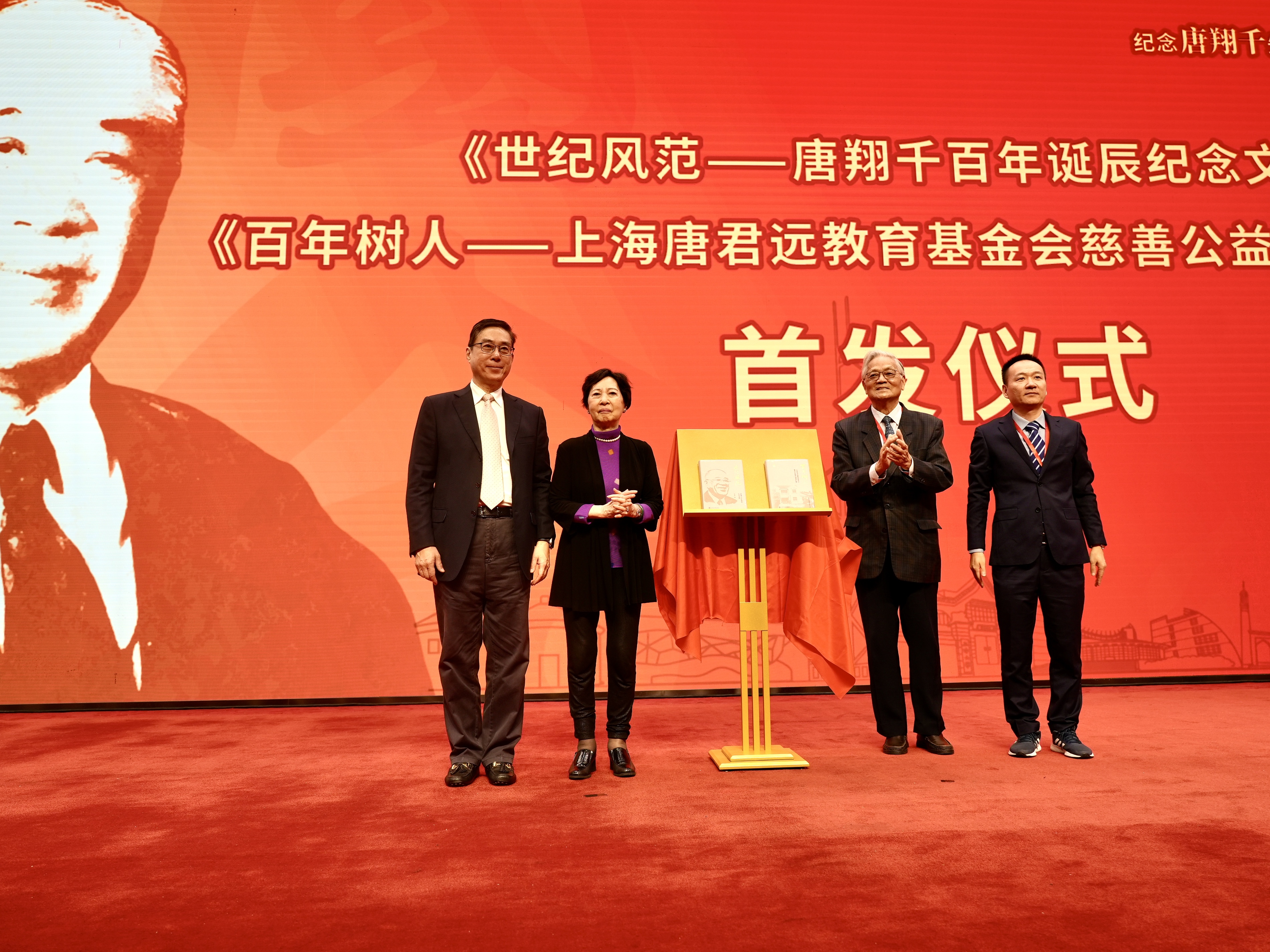 唐英年母親唐尤淑圻(左二)及弟弟唐慶年(左一)主持《世紀風範 - 唐翔千百年誕辰紀念文集》《百年樹人 - 上海唐君遠教育基金會慈善公益項目成果匯編》首次發行儀式。