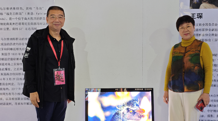 頂圖:王琛(左)與記者在其攝影作品《馬可羅尼企鵝》前合影。