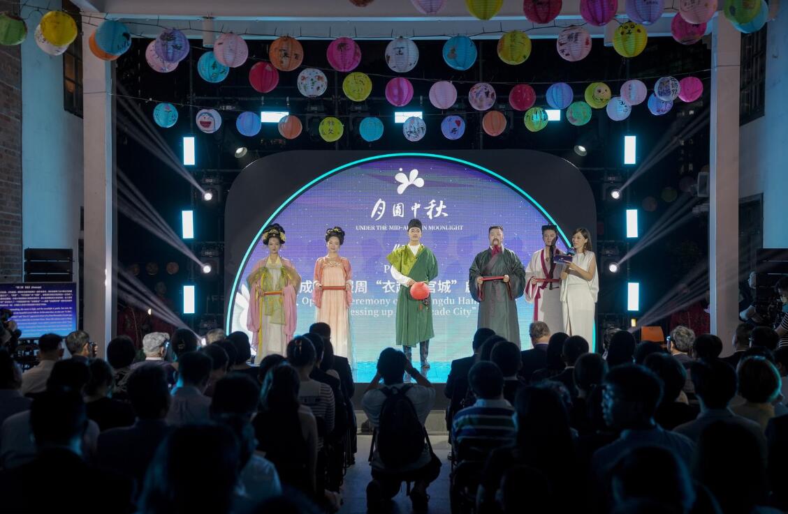 打破時空阻隔,穿越式古今對話,「李白」、「花蕊夫人」、「薛濤」、「司馬相如」和「范蠡」齊聚來到香港饒宗頤紀念館,共迎中秋佳節,共賞良辰美景。扮演這些人物的四位演員的名字也別有用意,花花、郝好、岳教授、元老闆,每位演員名字的第一個字組合在一起,正是「花」「好」「月」「圓」。明月高懸,溫柔的月光下,雙城聯動——成都漢服周「衣起錦官城」啟幕儀式正式開啟。「衣起錦官城」成都漢服周首次聯動全球多個城市,打造了「一節多城多場景」。隨着香港與成都經貿、文化往來的深入,兩個重要經濟圈的距離進一步拉近,雙方也將繼續攜手,唱好「雙城記」,加快促進兩地交流合作向更深更廣方向發展。