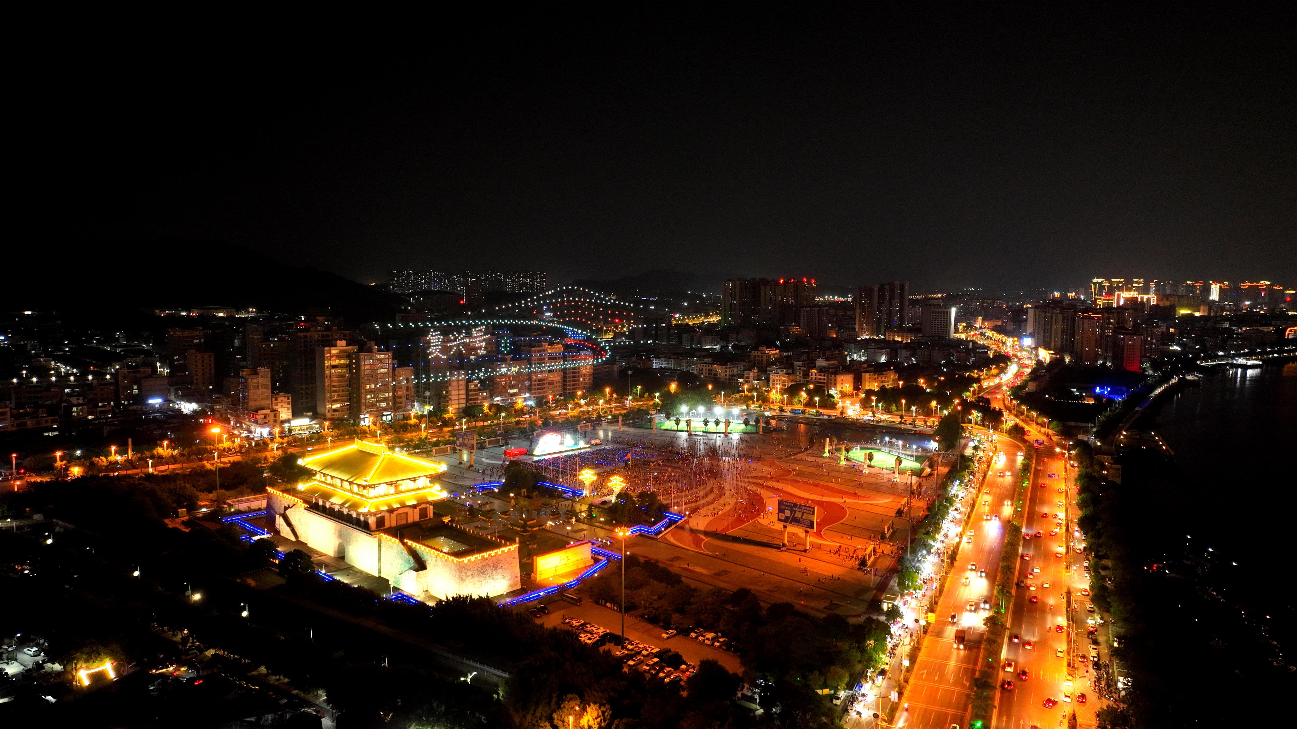 當晚,揭陽古城音樂會在揭陽樓廣場如約上演。500架無人機同時表演、燈光視覺秀震撼人心、英歌舞等揭陽特色文化串聯全場……