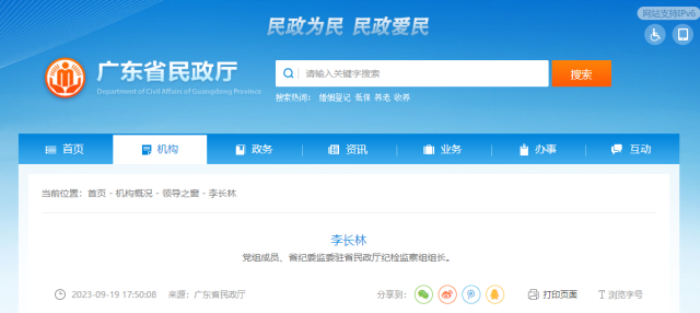 廣東省民政廳網站最新信息顯示,李長林已任廣東省民政廳黨組成員、省紀委監委駐省民政廳紀檢監察組組長。