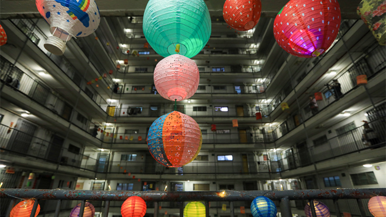 天變地變情不變,荃灣象山邨秀山樓一名居民,難忘小時中秋整座樓居民掛燈籠、玩蠟燭的歡樂,加上對愛妻的承諾,在2015年起,在屬「井字型」的公屋天井拉掛色彩繽紛的傳統紙燈籠,巨型燈籠陣持續多年,惟疫情期間停了兩年(2020年及2022年),今年疫情退卻,這名搞手重出江湖。他表示,初時掛燈籠,人們都很熱情,到現在已冷卻了不少,感嘆社會變得冷漠,跟人有莫大關係。不過其堅持已發生影響,今年九龍愛民邨有井字型樓宇也製作燈籠陣。