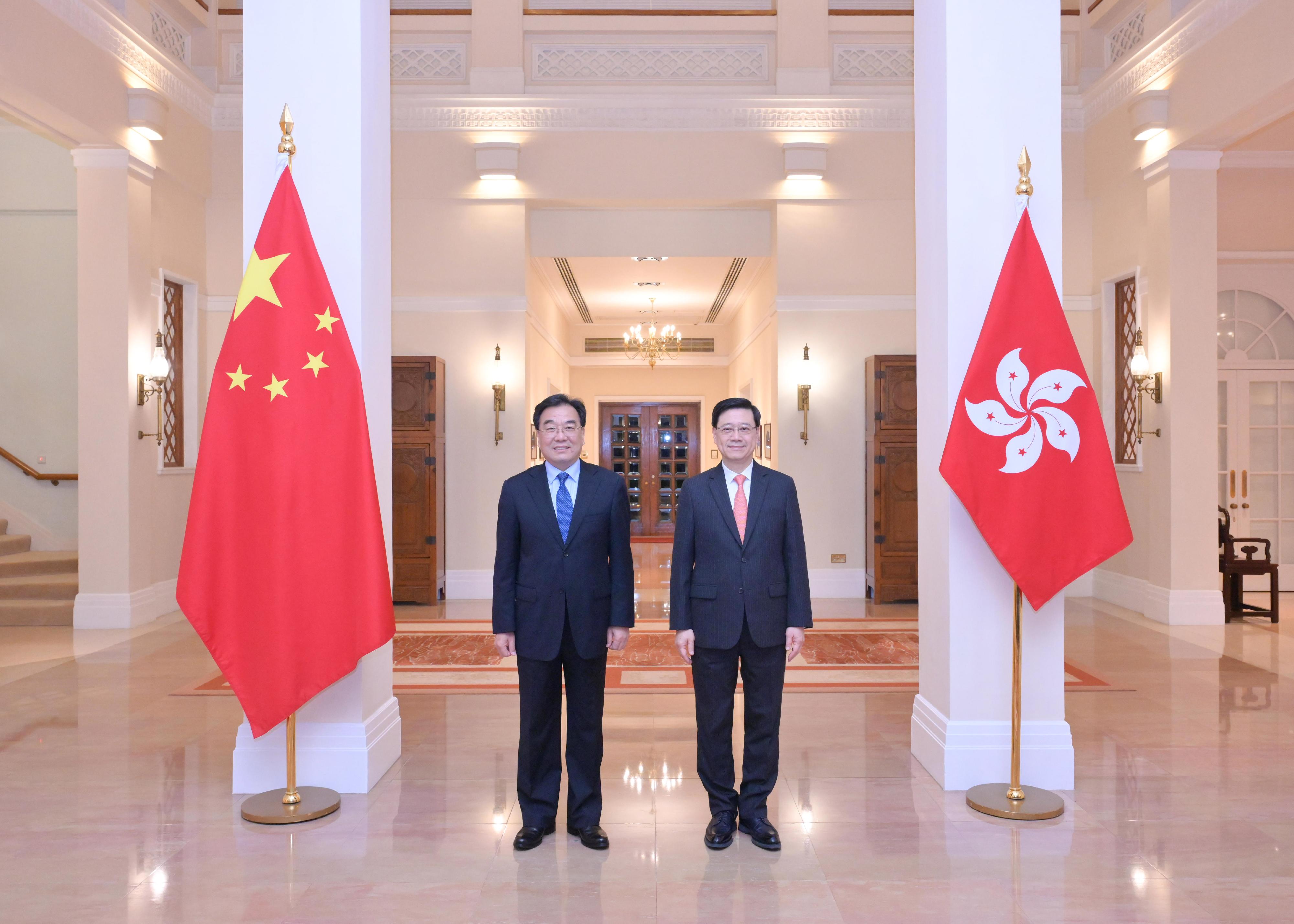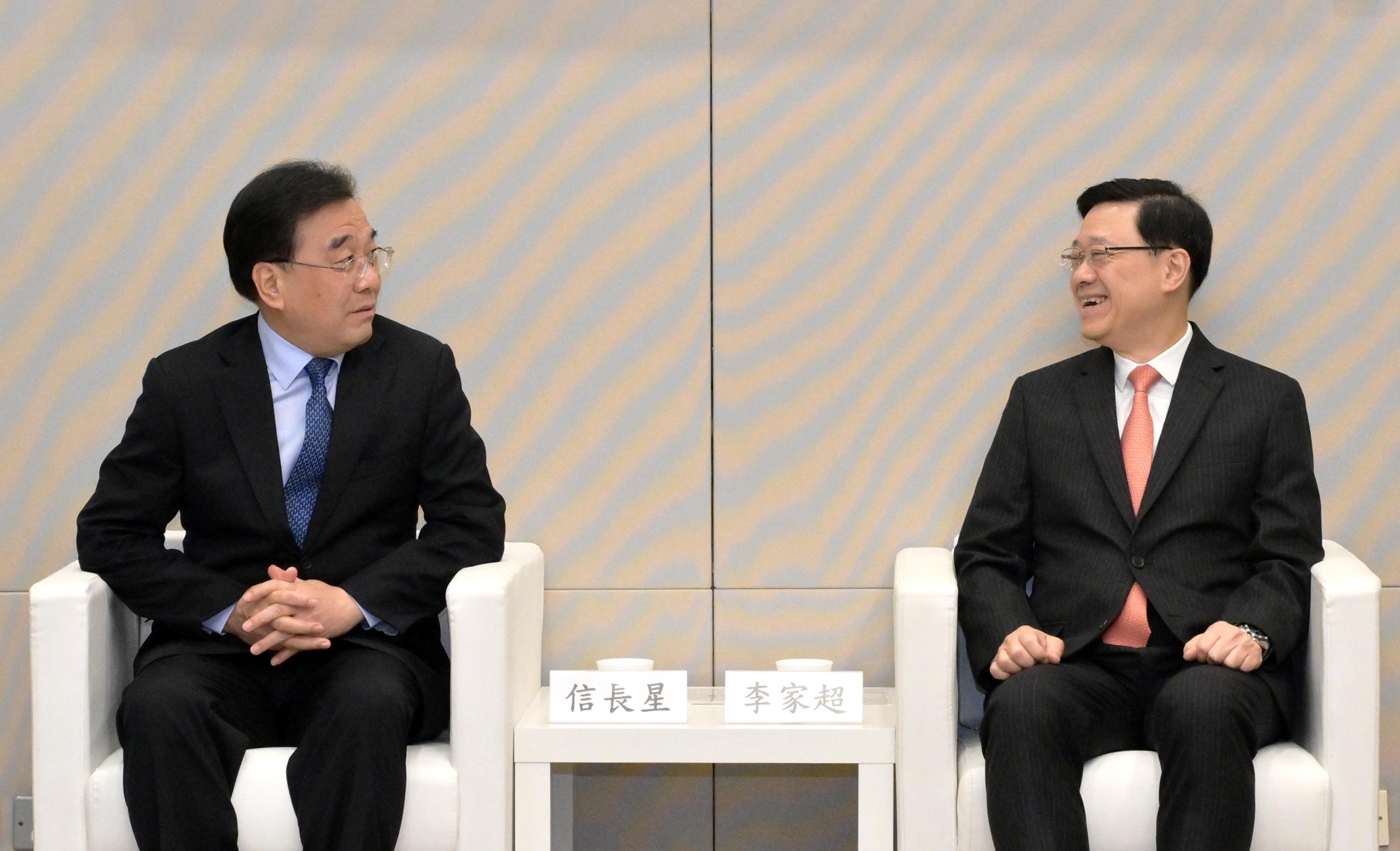 李家超(右)今日在禮賓府與江蘇省委書記信長星(左)會面。政府新聞處