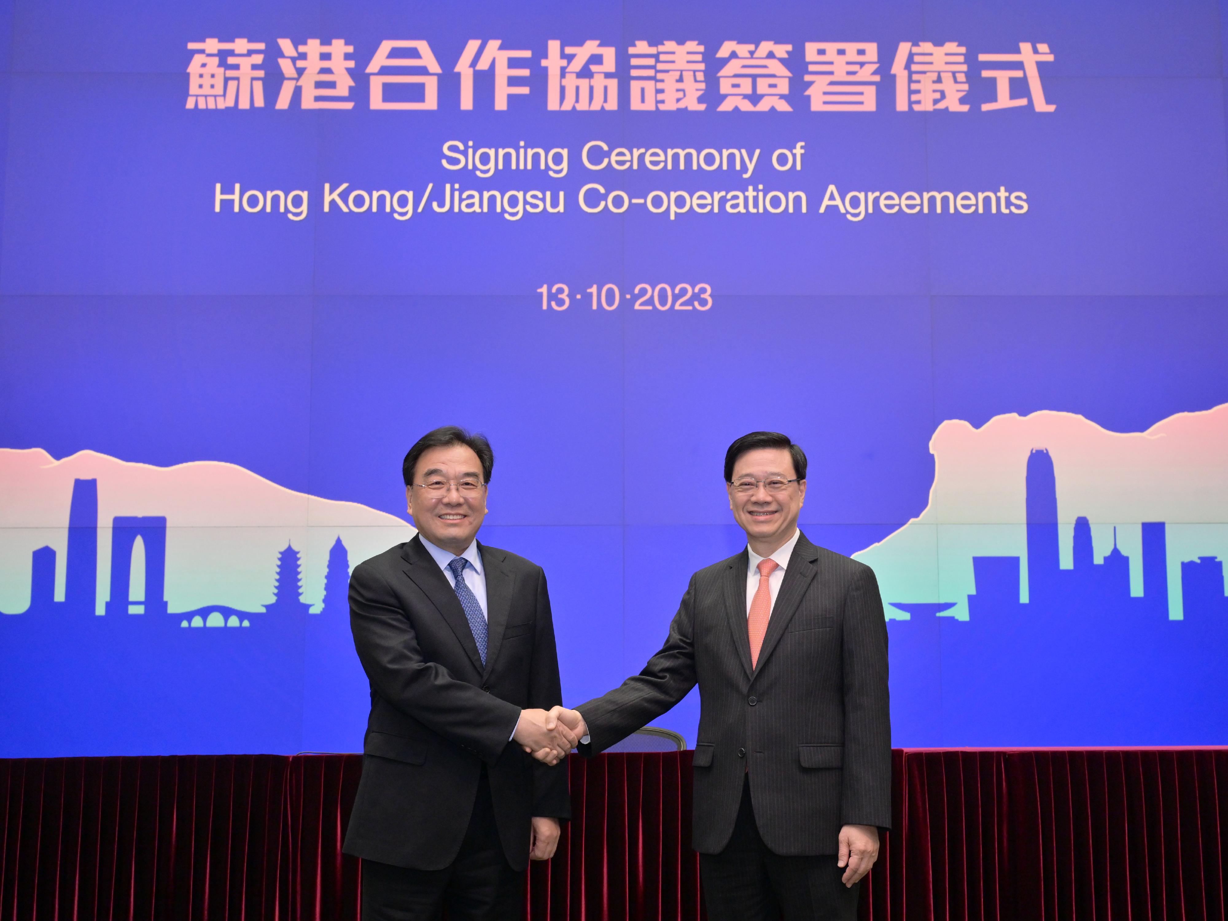 行政長官李家超率領香港特區政府代表團與江蘇省委書記信長星率領的江蘇省政府代表團今日(13日)在港舉行蘇港高層會晤暨蘇港合作協議簽署儀式,共同見證香港和江蘇兩地簽署多項合作協議,推進深化雙方的共同發展,強化優勢互補,實現互利共贏。
