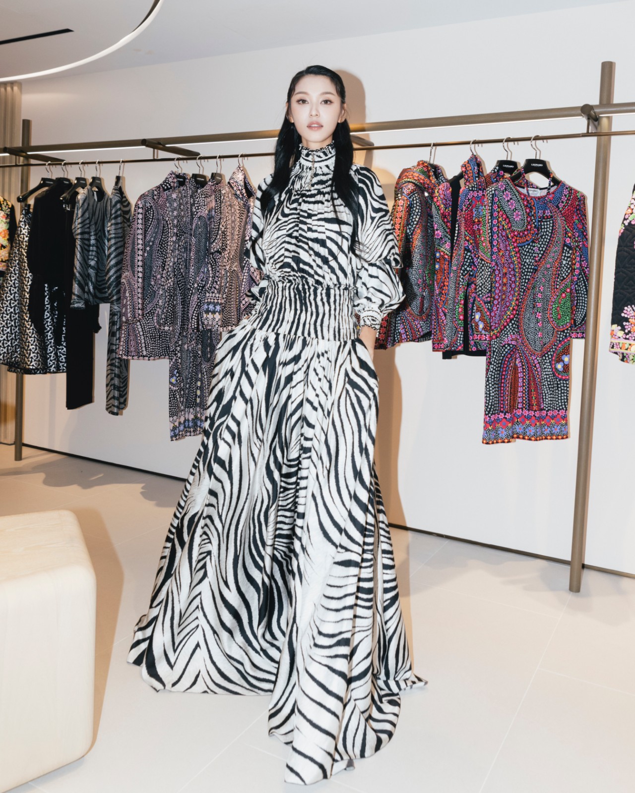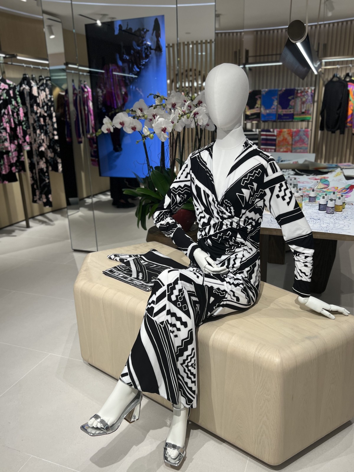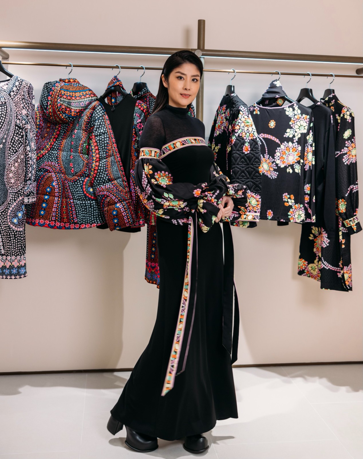 新店佔地近600平方呎,全店被大型圓形燈具設計圍繞,配襯白蠟木和石灰岩的陳列櫃,展示最新的秋冬系列。整個空間以木質和黃銅打造的迴廊環繞,搭配嬌嫩粉色牆壁,讓人猶如置身於色彩斑斕的印花世界。店內設有一個專門展示品牌標誌性配飾的空間,在精心打造的胡桃木大枱及精緻的實心黃銅陳列架上放滿品牌飾品及陳列品。