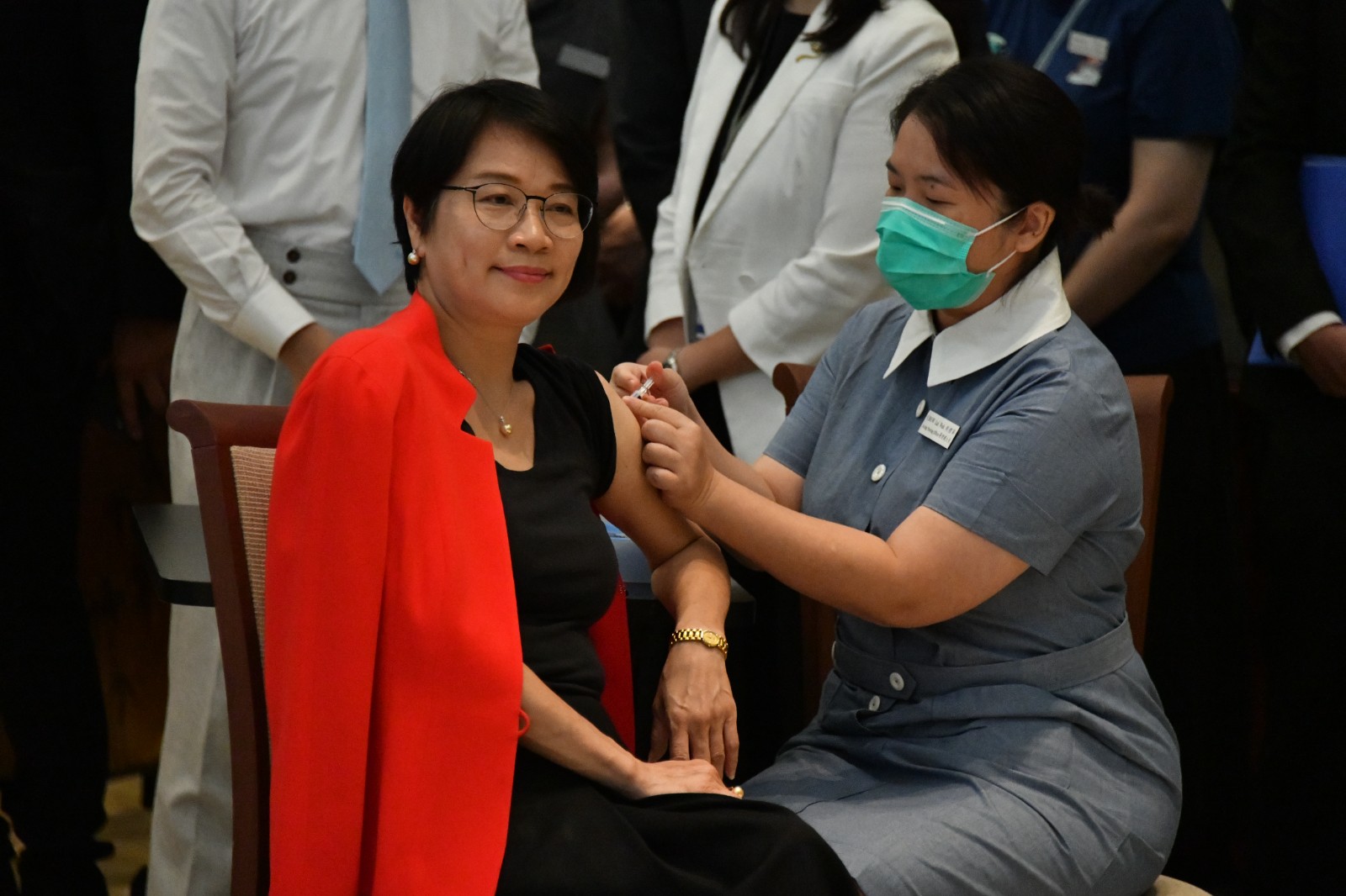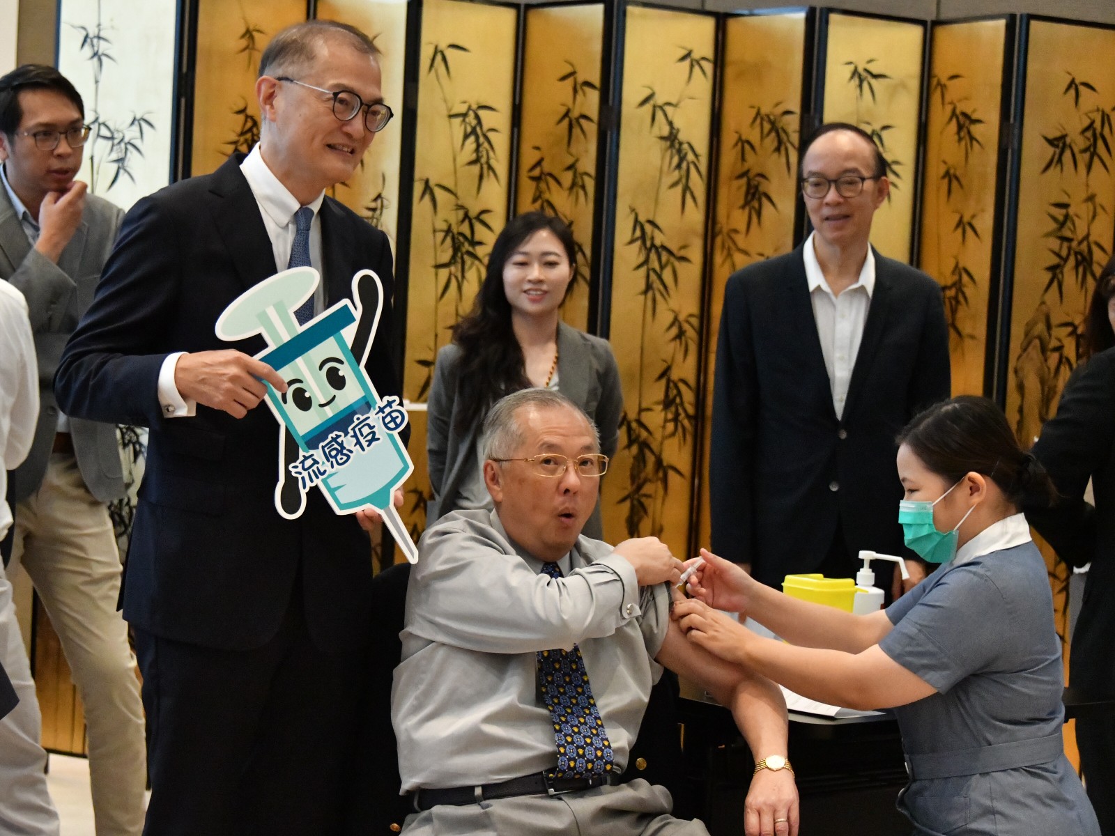 衛生署18日派員到立法會綜合大樓,為多名立法會議員接種流感疫苗。立法會主席梁君彥及醫務衞生局局長盧寵茂先後致辭。(記者蔡啟文攝)