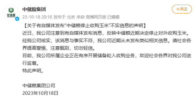 據中儲糧集團微博消息,近日,中儲糧集團公司注意到有自媒體發布消息,反映中儲糧近期決定停止對外收購玉米。經中儲糧集團公司核實,該消息與事實不符,中儲糧集團公司近期從未發布類似相關信息。請社會各界提高警惕,注意甄別,切勿輕信。