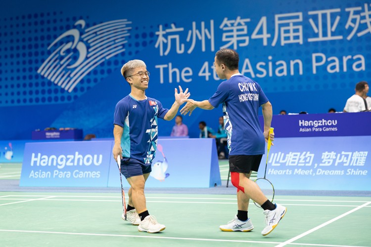 羽毛球賽事就進入最後階段,港隊成員今日分途出戰4強賽,其中朱文佳在SH6男單4強以21比12、21比10擊敗隊友王鎮炎,將在決賽鬥印度球手,力爭衛冕;王鎮炎則連續兩屆摘下單打銅牌。兩人同日合作出戰男子SH6雙打,於4強以21比8、21比5擊敗印度組合,坐銀望金。