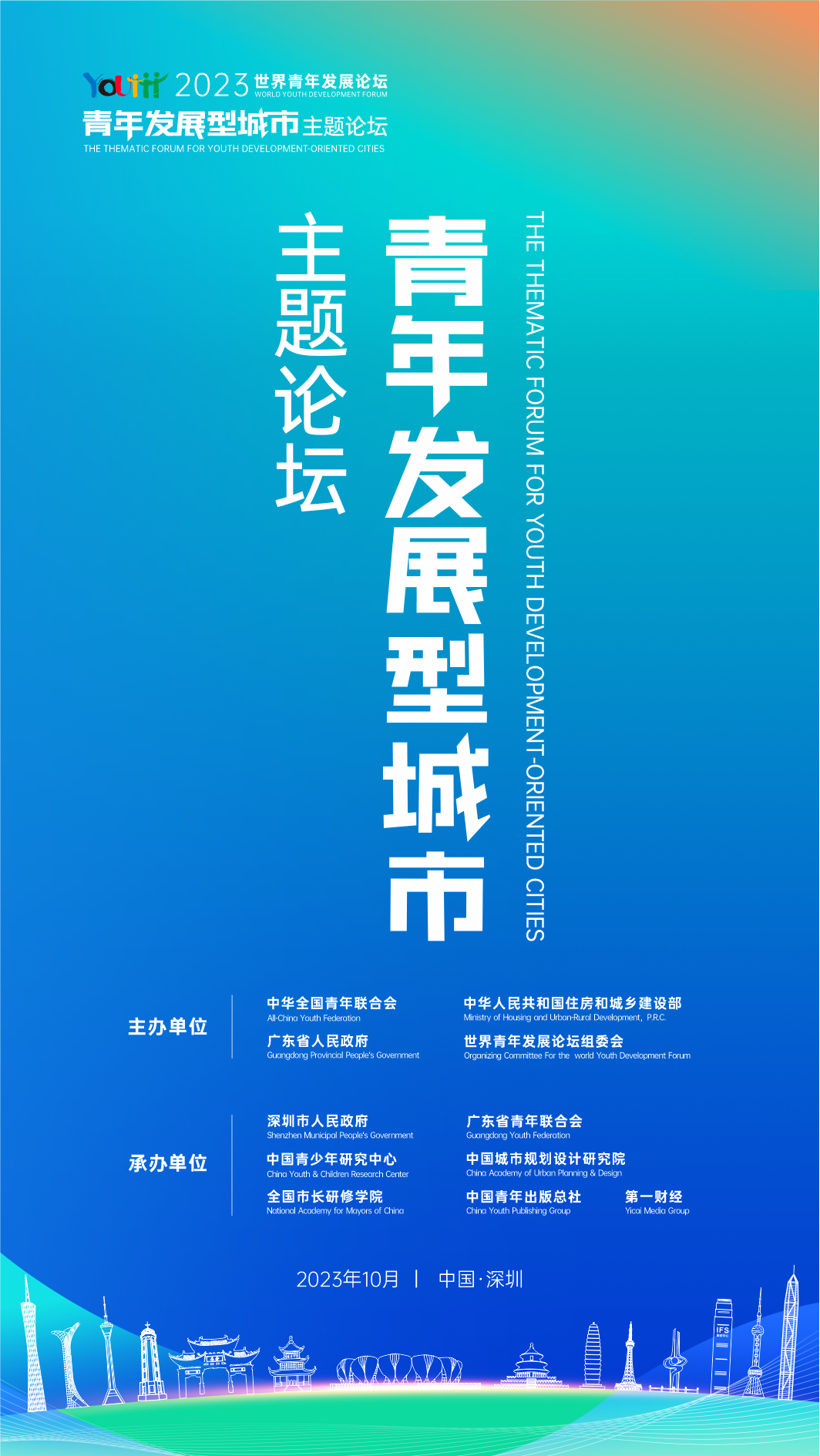 作為論壇四場主題論壇之一,青年發展型城市主題論壇將於10月31日至11月1日在深圳舉辦。主題論壇由中華全國青年聯合會、住房和城鄉建設部、廣東省人民政府、世界青年發展論壇組委會主辦,深圳市人民政府、廣東省青年聯合會、中國青少年研究中心、中國城市規劃設計研究院、全國市長研修學院、中國青年出版總社、第一財經承辦。