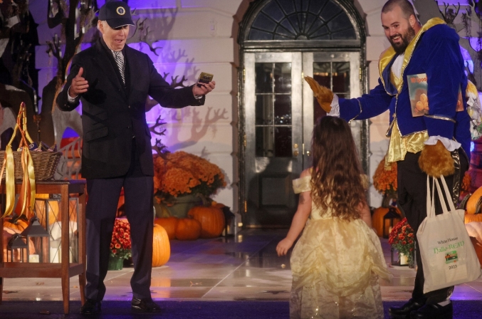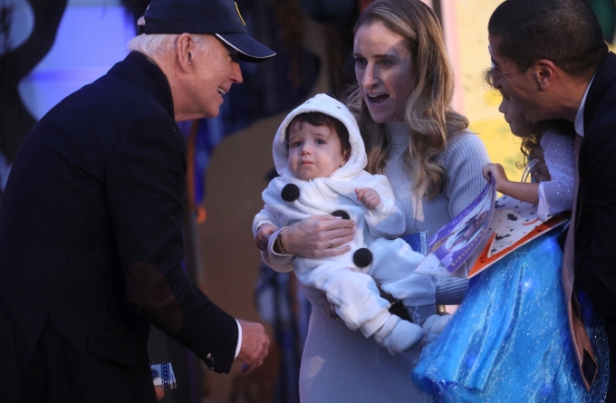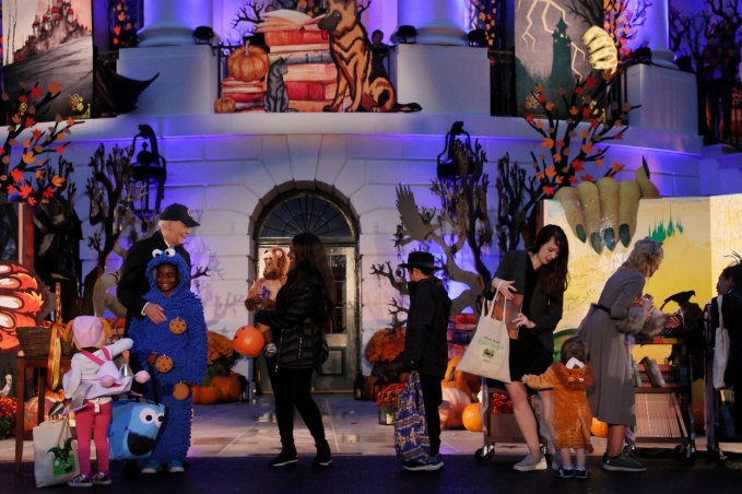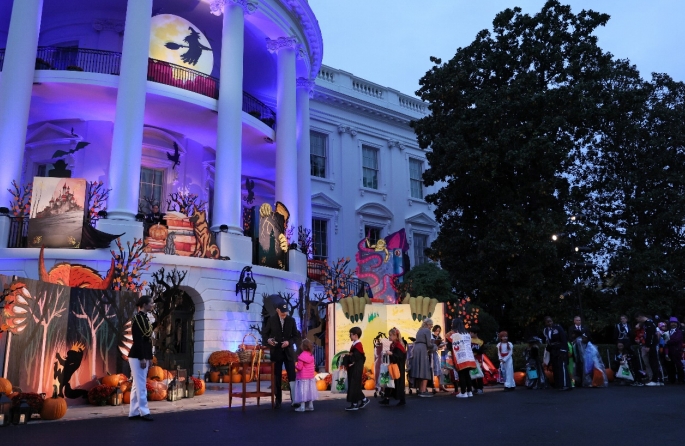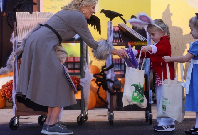 美國白宮當地時間10月30日舉行萬聖節派對,小朋友穿上萬聖節服裝到白宮「Trick-or-Treat」,總統拜登把裝在小盒子的朱古力分發給小朋友。從事教師30多年的第一夫人吉爾則化上貓咪妝、戴上貓耳和貓尾,扮成她的寵物貓Willow,為小朋友朗讀故事《十個幽靈南瓜》,以及贈送故事書。白宮表示,有約8000人參與萬聖節派對。