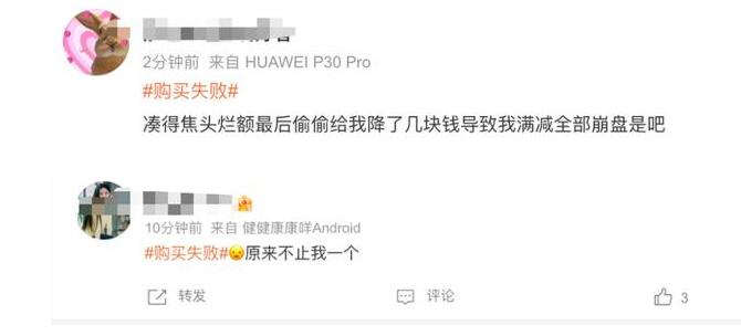 不少網友遭遇平台提示「優惠信息變更,購買失敗」的情況。
