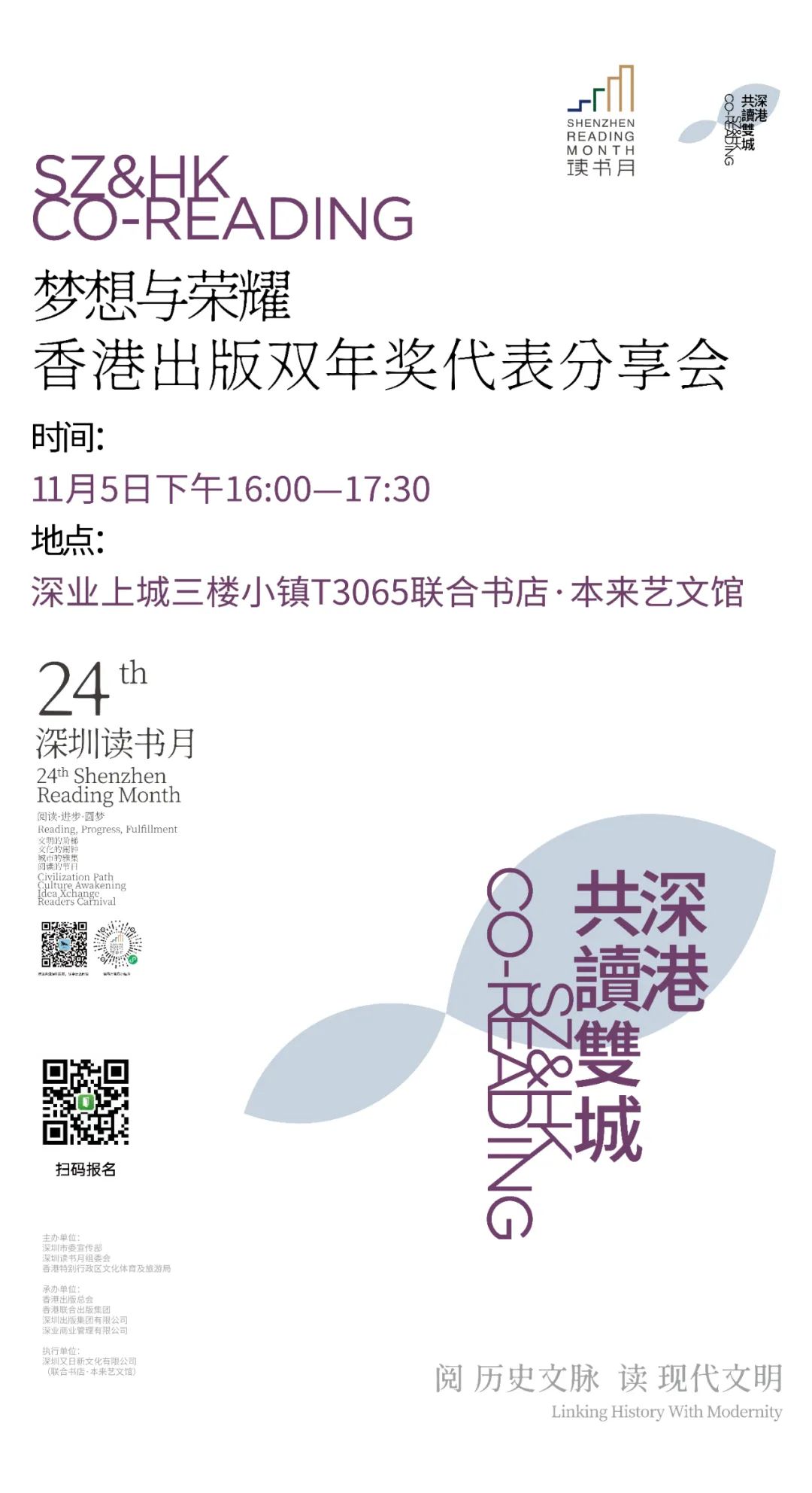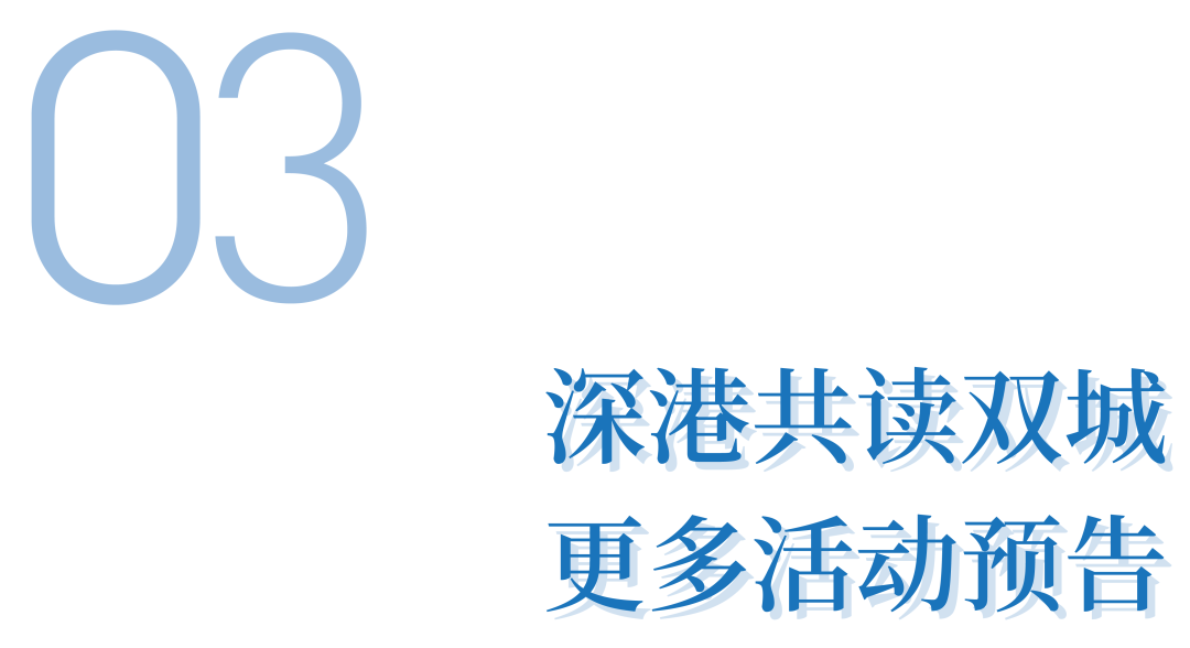 PS:「深港共讀雙城」系列活動由深圳市委宣傳部、深圳讀書月組委會、香港特別行政區文化體育及旅遊局及香港出版總會主辦,香港聯合出版集團、深圳出版集團及深業商業管理有限公司承辦,執行單位深圳又日新文化有限公司(聯合書店·本來藝文館)。
