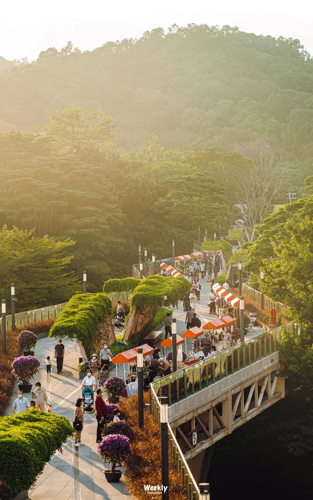幸福廊橋書市坐落在深業上城L3小鎮西廣場和蓮花山幸福廊橋上,以繁花和綠意為幕,是快節奏生活下的靜謐之地。它以閱讀作為連接不同靈魂的橋樑,每個人都能在此自由交流、找到共鳴。