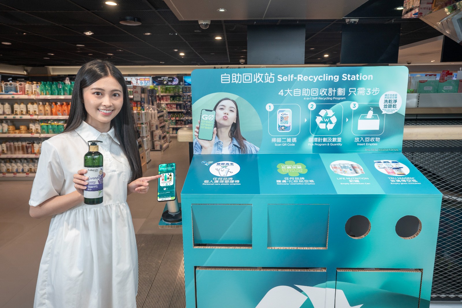 此外,店內新增頭皮及頭髮、口腔護理專區,將個人護理體驗智能化。還設有可持續發展專區及Naturals by Watsons環保補充站及「自助回收站」,回收箱以環保瓦通紙設計,收集任何品牌的個人護理塑膠樽、護膚或化妝品的空瓶等,並可儲存獎賞積分或電子印花,換購其他產品。 (記者、部分圖片:Janice)