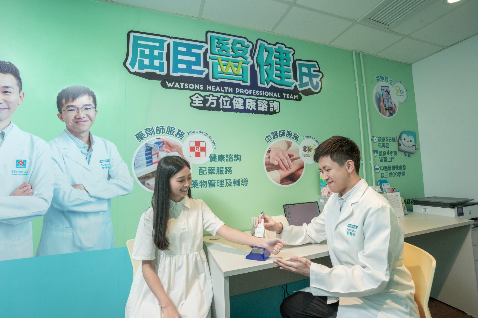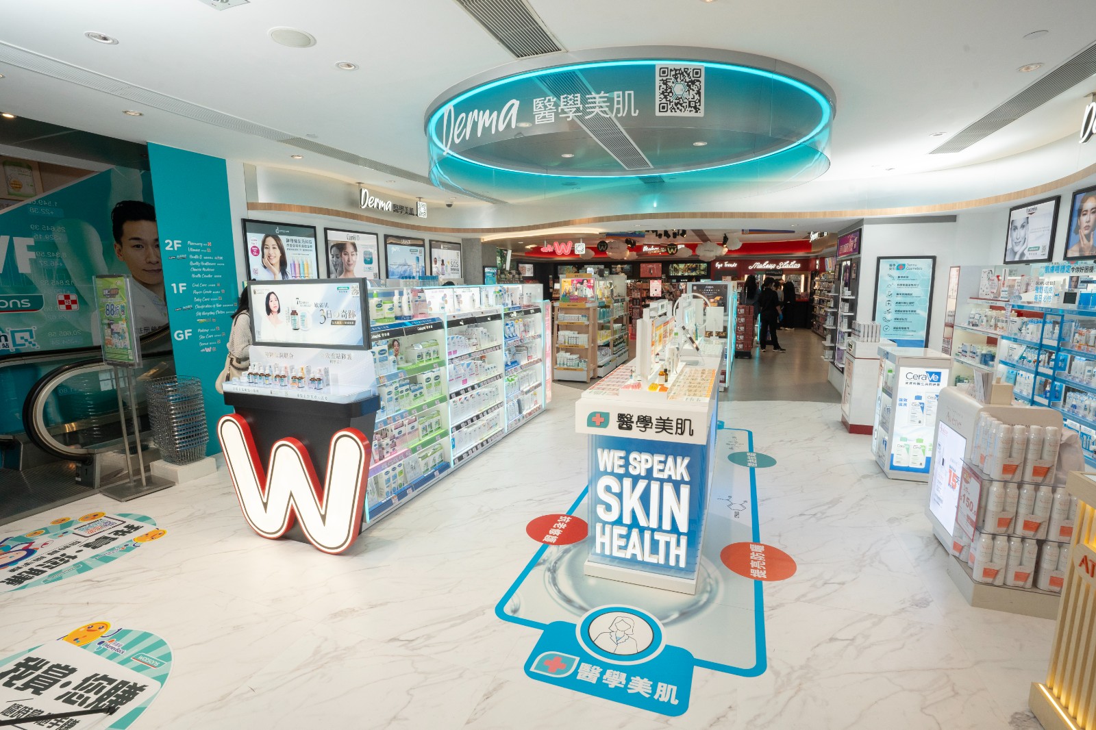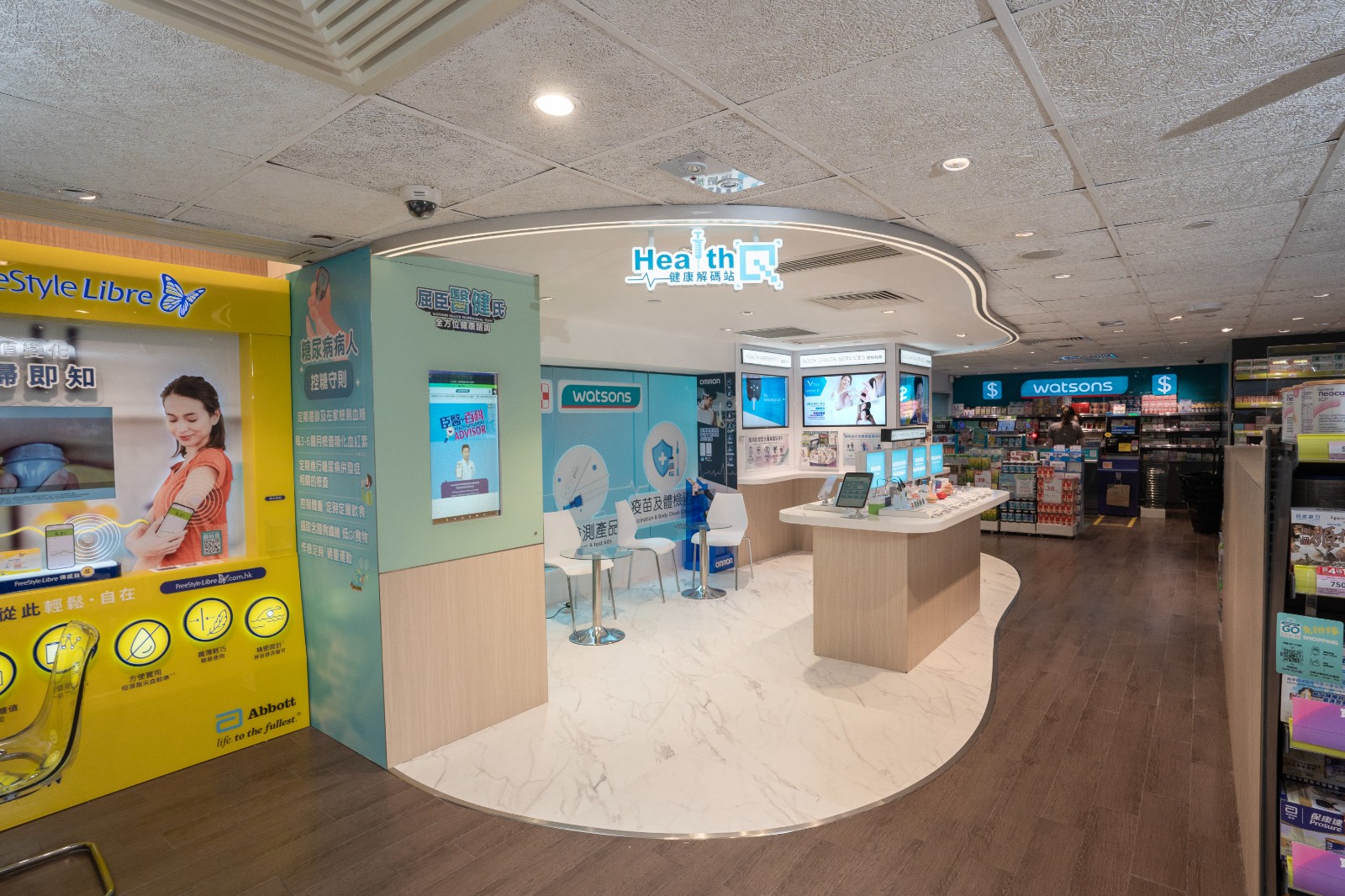 旗艦店樓高三層,面積逾8000平方呎。首設HealthQ健康解碼站,提供免費健康諮詢服務。除了註冊藥劑師、中醫師及營養師提供意見及配藥服務外,亦提供疫苗及身體檢查選擇,集合各類型健康分析儀器及檢測工具。店內新增會員20大免費健康評估服務,包括三高、心臟健康等評估,身體組成分析如身高體重,內在及外在脂肪、黃斑自我檢測等測量,透過品牌的視像醫生APP,與醫生連線進行視像會診,感受O+O模式的便利。