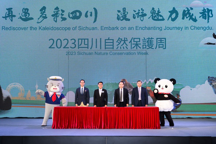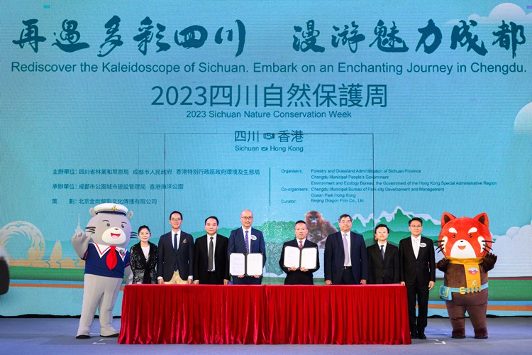 頂圖圖説:「2023四川自然保護周」正式啟動。左至右分別為海洋公園公司副行政總裁暨首席財務總監陳善瑜、香港海洋公園保育基金主席陳晴、海洋公園公司主席龐建貽、四川省林業和草原局局長李天滿、漁農自然護理署署長梁肇輝、成都市公園城市建設管理局機關黨委書記周靈,以及海洋公園公司行政總裁黃嗣輝。
