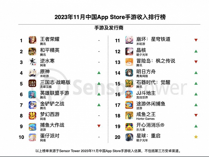 在2023年11月中國App Store手遊收入排行榜方面,騰訊旗下的《王者榮耀》《和平精英》和網易旗下的《逆水寒》分別位居前3位。