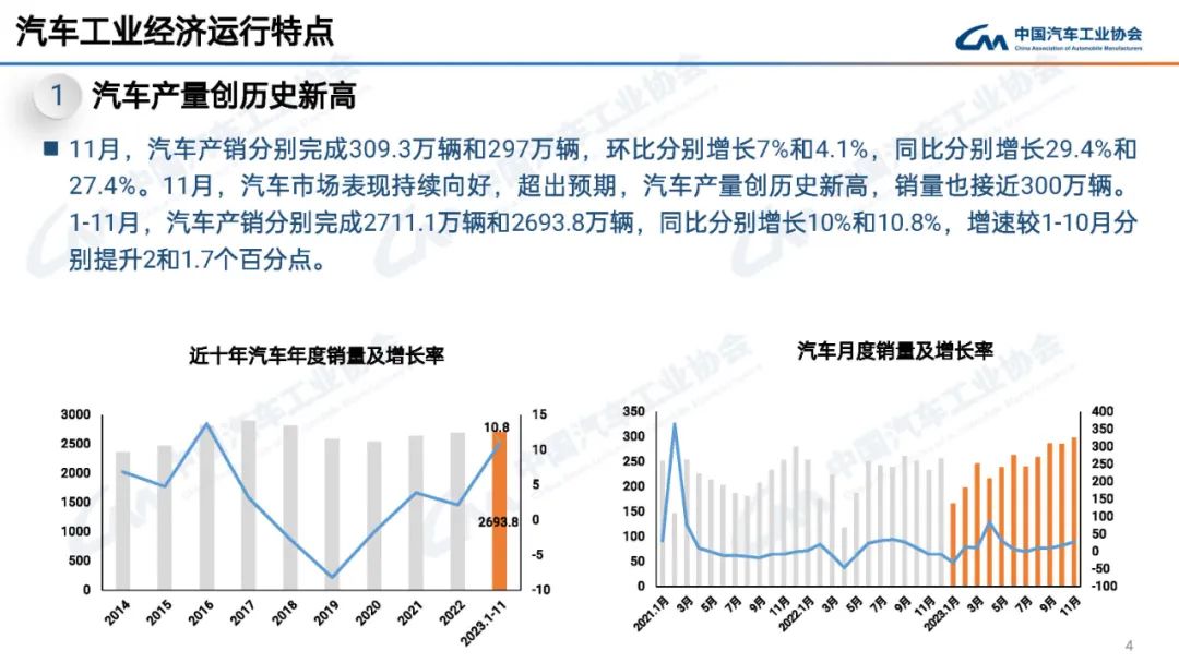 「中汽協會數據」微信號11日發布2023年11月汽車工業產銷情況顯示,11月,汽車產銷分別完成309.3萬輛和297萬輛,同比分別增長29.4%和27.4%;11月,新能源汽車產銷分別完成107.4萬輛和102.6萬輛,同比分別增長39.2%和30%。