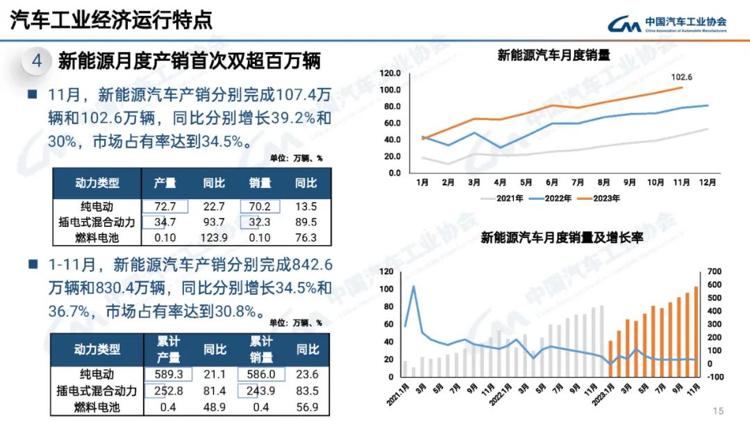 1-11月,新能源汽車產銷分別完成842.6萬輛和830.4萬輛,同比分別增長34.5%和36.7%,市場佔有率達到30.8%。