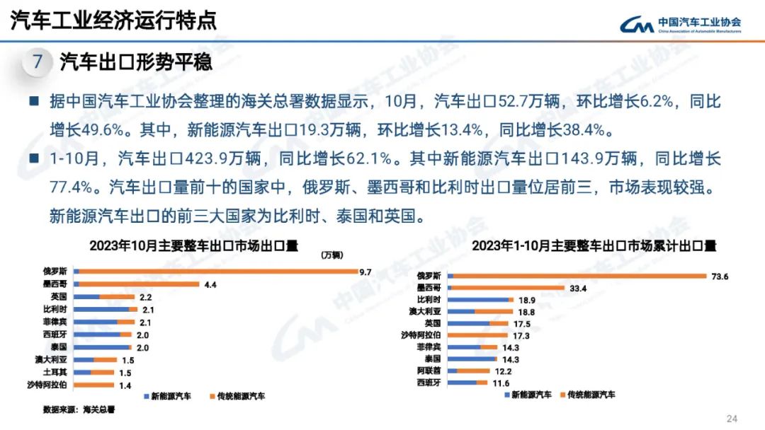 據中國汽車工業協會整理的海關總署數據顯示,10月,汽車出口52.7萬輛,環比增長6.2%,同比增長49.6%。其中,新能源汽車出口19.3萬輛,環比增長13.4%,同比增長38.4%。1-10月,汽車出口423.9萬輛,同比增長62.1%。其中新能源汽車出口143.9萬輛,同比增長77.4%。汽車出口量前十的國家中,俄羅斯、墨西哥和比利時出口量位居前三,市場表現較強。新能源汽車出口的前三大國家為比利時、泰國和英國。