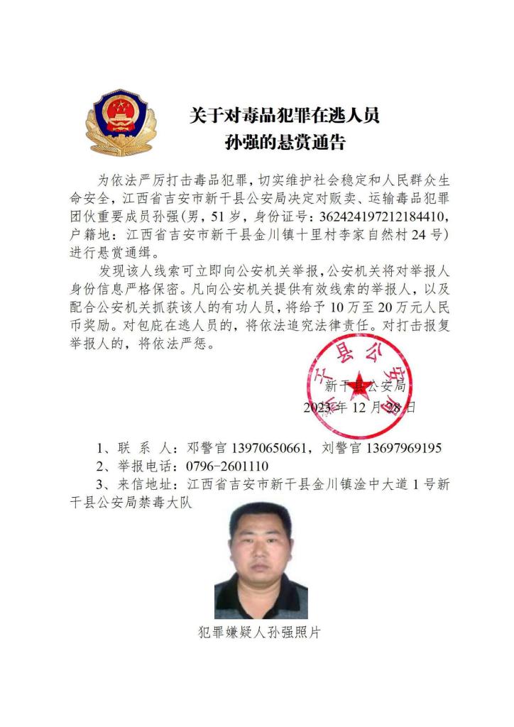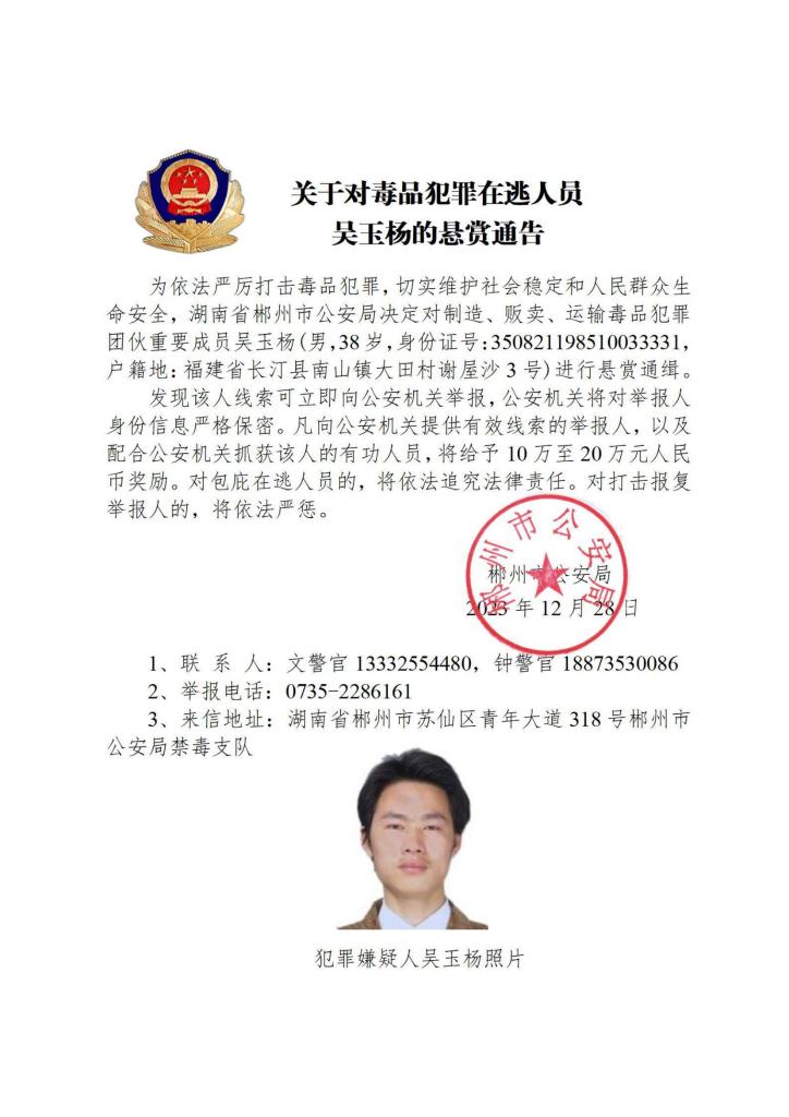 其中,湖南省郴州市公安局決定對張安龍、馬文祥、吳玉楊進行公開懸賞通緝;湖南省株洲市公安局決定對楊金梅進行公開懸賞通緝;江西省新幹縣公安局決定對曾小勇、李國平、孫強進行公開懸賞通緝;浙江省溫州市公安局決定對顏歡平進行公開懸賞通緝;四川省遂寧市公安局決定對母朝東進行公開懸賞通緝;貴州省黔東南州公安局決定對龍華進行公開懸賞通緝。