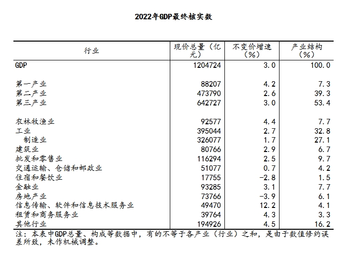據國家統計局網站消息,按照我國國內生產總值(GDP)核算和數據發布制度規定,年度GDP核算包括初步核算和最終核實兩個步驟。近日,根據國家統計局統計年報、財政部財政決算和有關部門年度財務資料等,國家統計局對2022年GDP數據進行了最終核實,主要結果如下: