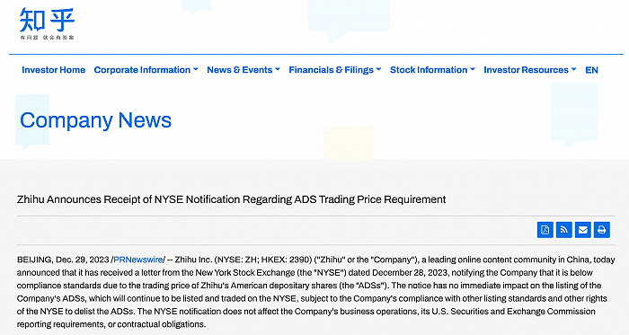 12月29日,知乎宣布,公司收到紐約證券交易所的信函,通知公司美國存托股票(ADS)的交易價格低於合規標準。該通知對公司美國存托憑證的上市沒有立即影響,公司將監控市場狀況,目前仍在考慮解決該問題的方案。