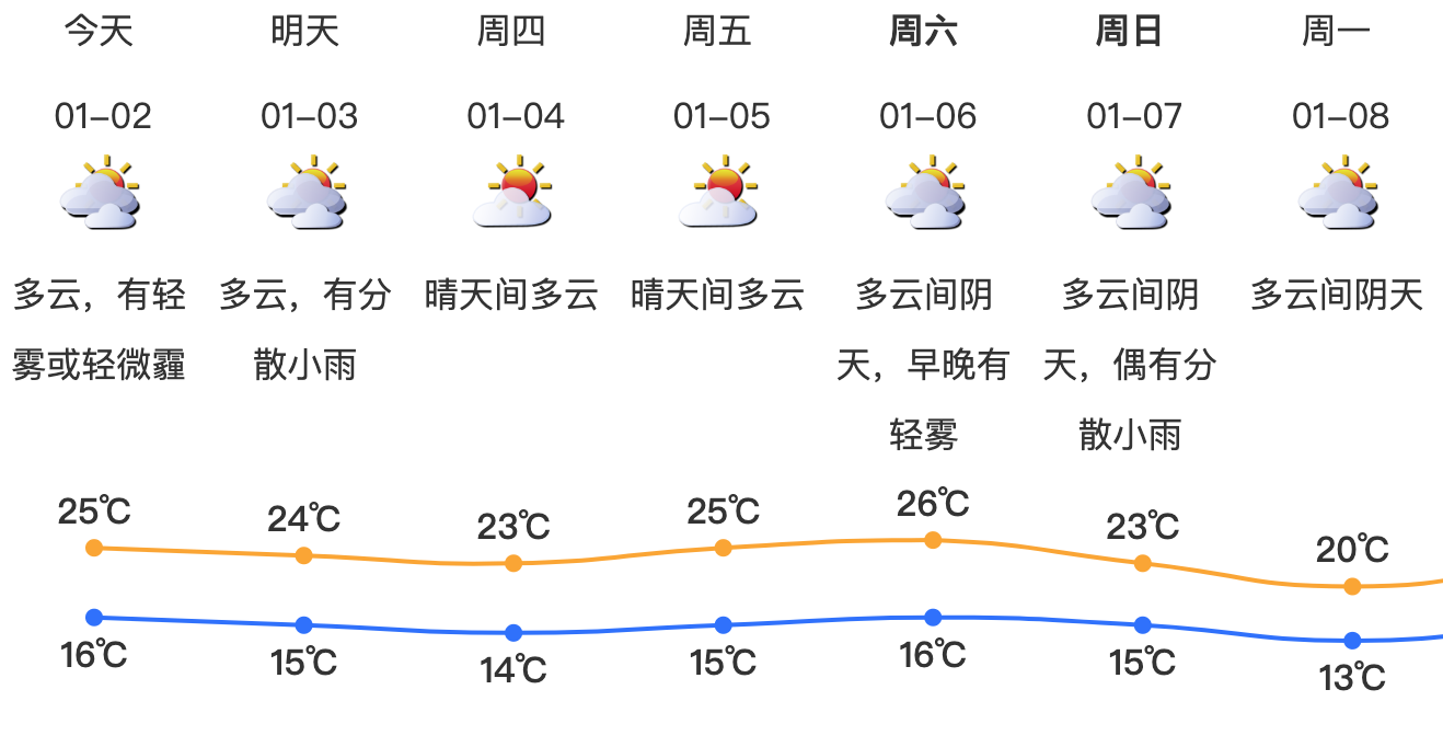 2日大致多雲,天氣溫暖,部分時間有輕霧或輕微霾;