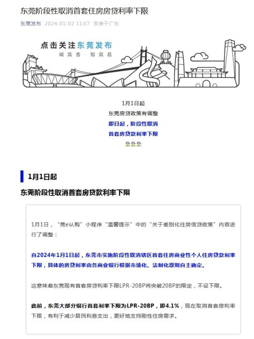 據「東莞發布」微信公眾號消息,自2024年1月1日起,廣東省東莞市實施階段性取消轄區首套住房商業性個人住房貸款利率下限,具體的房貸利率由各商業銀行根據市場化、法制化原則自主確定。這意味着東莞現有首套房貸利率下限LPR-20BP將突破20BP的限定,不設下限。
