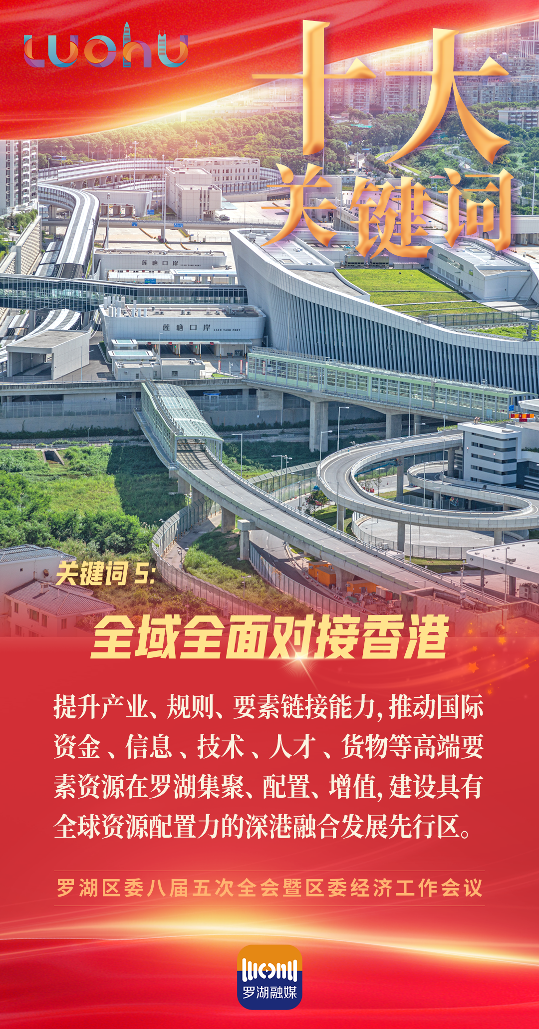 1月4日,中國共產黨深圳市羅湖區第八屆委員會第五次全體會議暨區委經濟工作會議召開。會議總結復盤了2023年度羅湖十件大事及高質量發展成果;推進「雙向奔赴」深港深度融合發展改革;在全面融入深圳「五個中心」建設,構建高質量發展新格局中,積極建設「具有全球資源配置力的深港融合發展先行區、具有世界潮流引領力的國際消費中心核心區、具有國際市場輻射力的現代服務業集聚示範區」產業發展目標,制定三個「三年行動方案」,抓住深港融合高質量發展的關鍵機遇節點,全域全面對接香港
