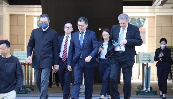 頂圖:代表黎智英的兩名律師何俊豪(前排右二)及司嘉勳(Steel Kevin)(前排右一)。 記者 馮瀚文攝