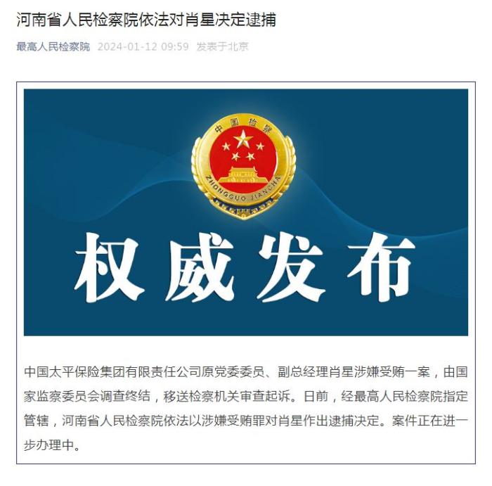 據最高人民檢察院微信公眾號消息,中國太平保險集團有限責任公司原黨委委員、副總經理肖星涉嫌受賄一案,由國家監察委員會調查終結,移送檢察機關審查起訴。日前,經最高人民檢察院指定管轄,河南省人民檢察院依法以涉嫌受賄罪對肖星作出逮捕決定。案件正在進一步辦理中。