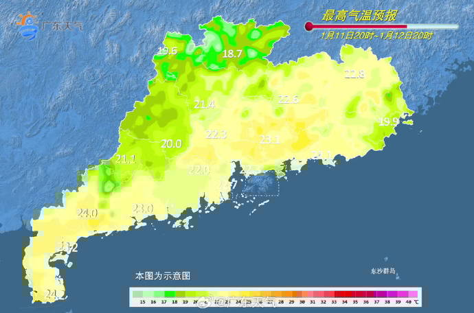 廣東省1月11日20時-1月12日20時最高氣溫預報。圖源:@廣東天氣