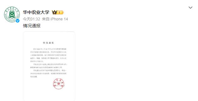 1月19日凌晨,華中農業大學在官方微博發布情況通報:針對2024年1月16日網上關於華中農業大學教師黃某某學術不端等問題的舉報信息,學校學術道德委員會成立調查組開展調查,在已調查材料中發現所反映的實驗圖片、數據、結果等方面問題基本屬實,初步認定存在學術不端行為。學校決定即日起停止黃某某校內所有職務和工作,組建導師組全面負責該課題組研究生培養工作。