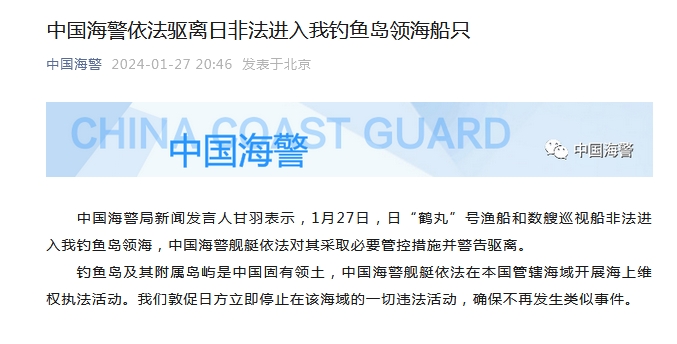 據中國海警官方微信公眾號27日消息,中國海警局新聞發言人甘羽表示,1月27日,日「鶴丸」號漁船和數艘巡視船非法進入我釣魚島領海,中國海警艦艇依法對其採取必要管控措施並警告驅離。