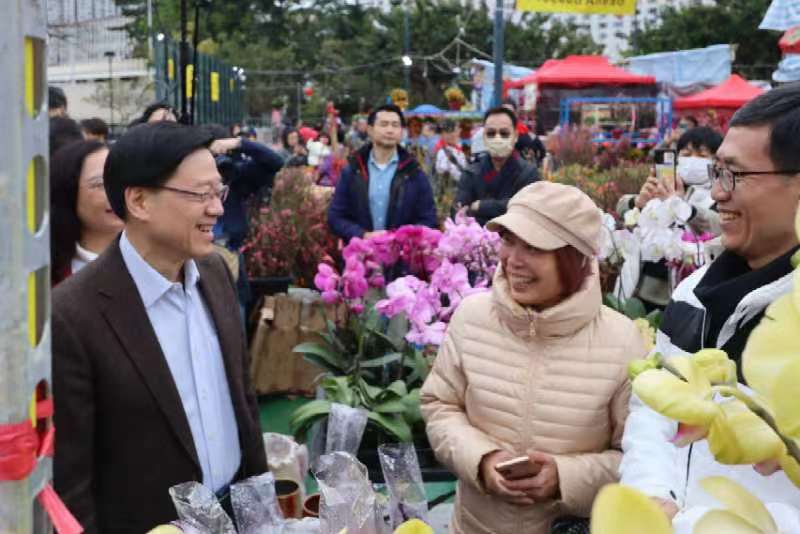 行政長官李家超今早到沙田行花市,期間與檔主及市民交流。(記者馮瀚文 攝)
